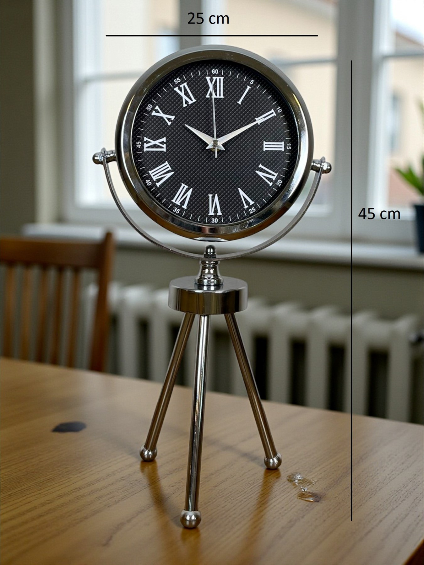 45 x 25 cm ölçülerindeki bu şık krom üç ayaklı masa saati, modern tasarımı ve parlak metal gövdesiyle her ortamda dikkat çeken zarif bir dekorasyon ürünüdür. Gerçek cam korumalı kadranı sayesinde uzun ömürlü ve net bir görüntü sunar. Sessiz çalışan mekanizması ile ev, ofis ve çalışma alanlarında konforlu bir kullanım sağlar. Dayanıklı metal tripod ayak yapısı, saati sadece bir zaman göstergesi değil aynı zamanda estetik bir obje haline getirir.