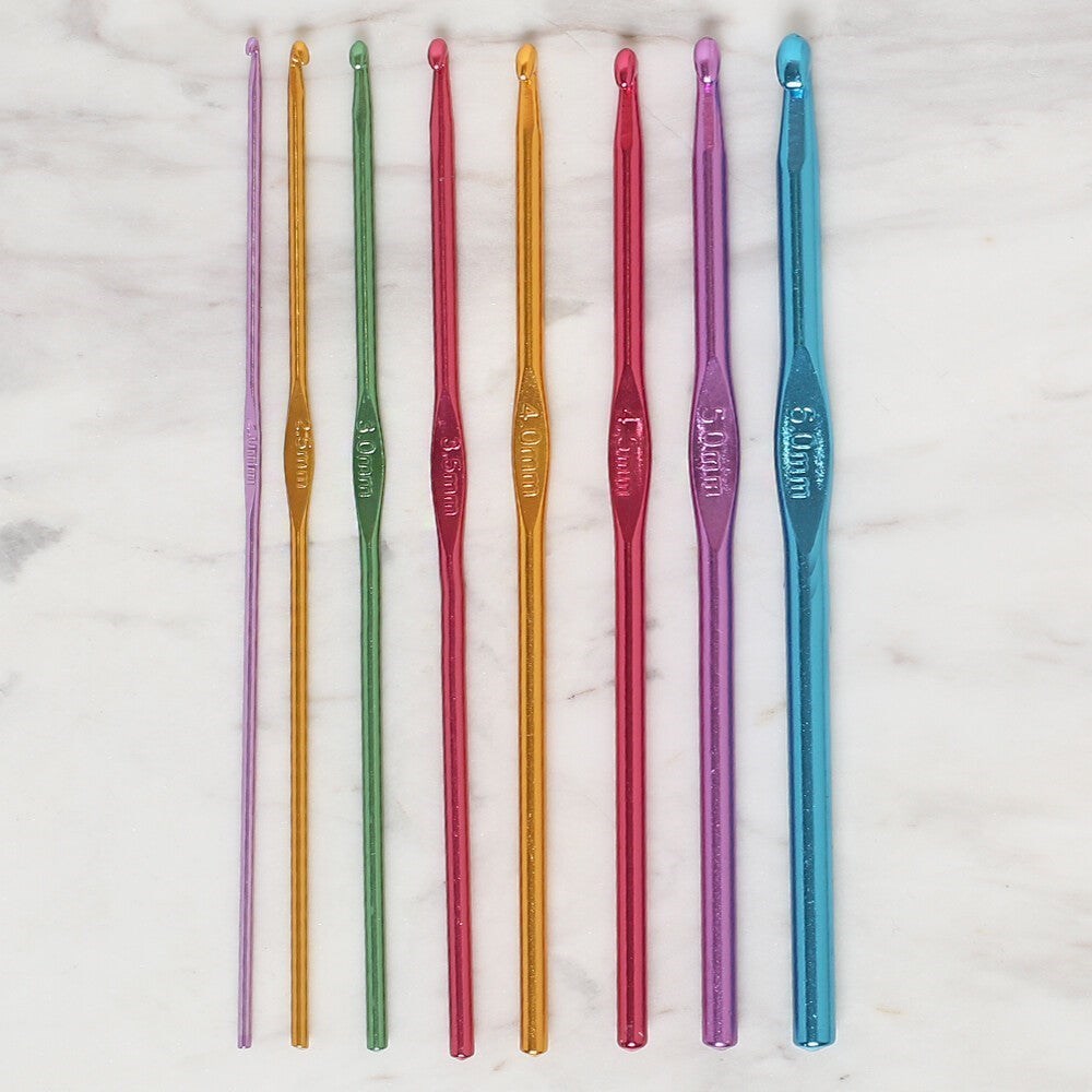 - Renkli Metal Yün Tığ numaraları; 2 mm, 2.5 mm, 3 mm, 3.5 mm, 4 mm, 4.5 mm, 5 mm, 6 mm,
