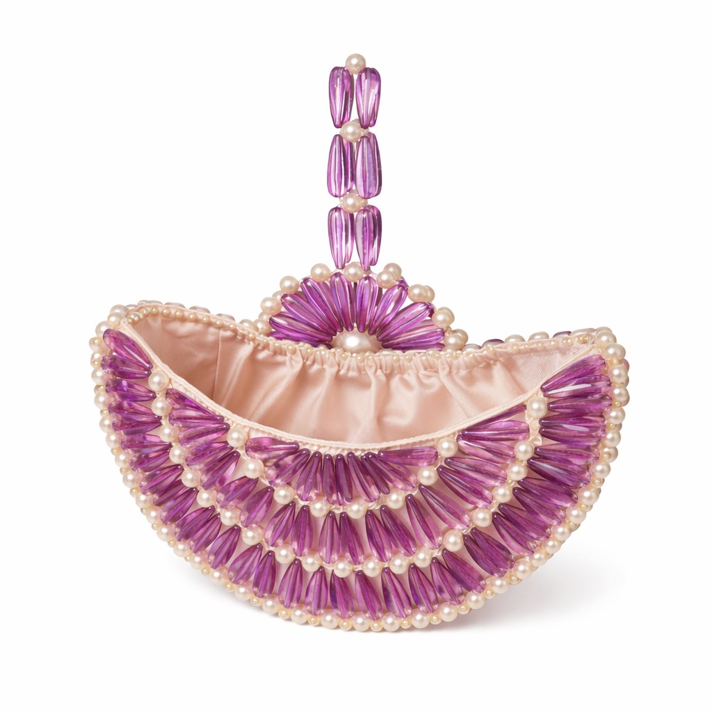 Atelier Emine’in Crystal Gelato Couture koleksiyonuna ait Melo Iris, merkezden dışa doğru genişleyen radyal örgü mimarisiyle tasarlanmış, heykelsi karaktere sahip premium el yapımı kristal mini çanta modelidir.