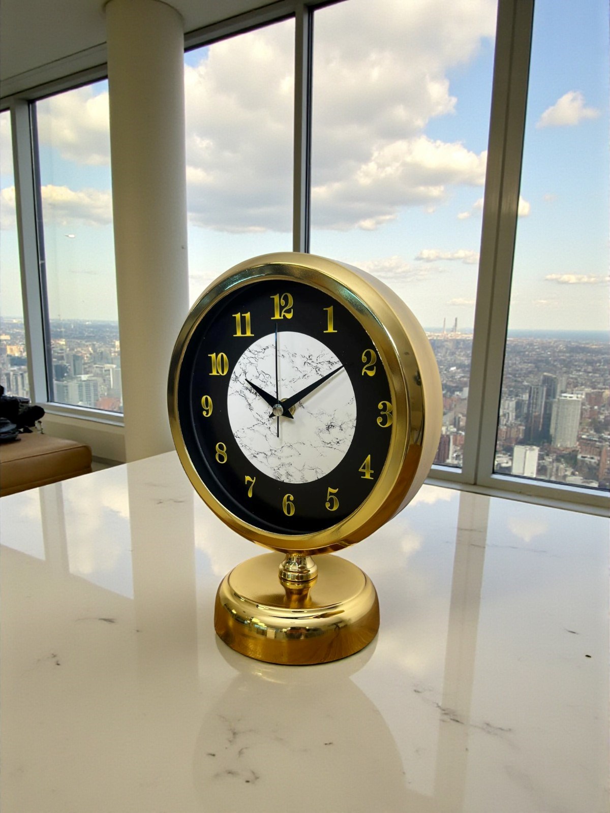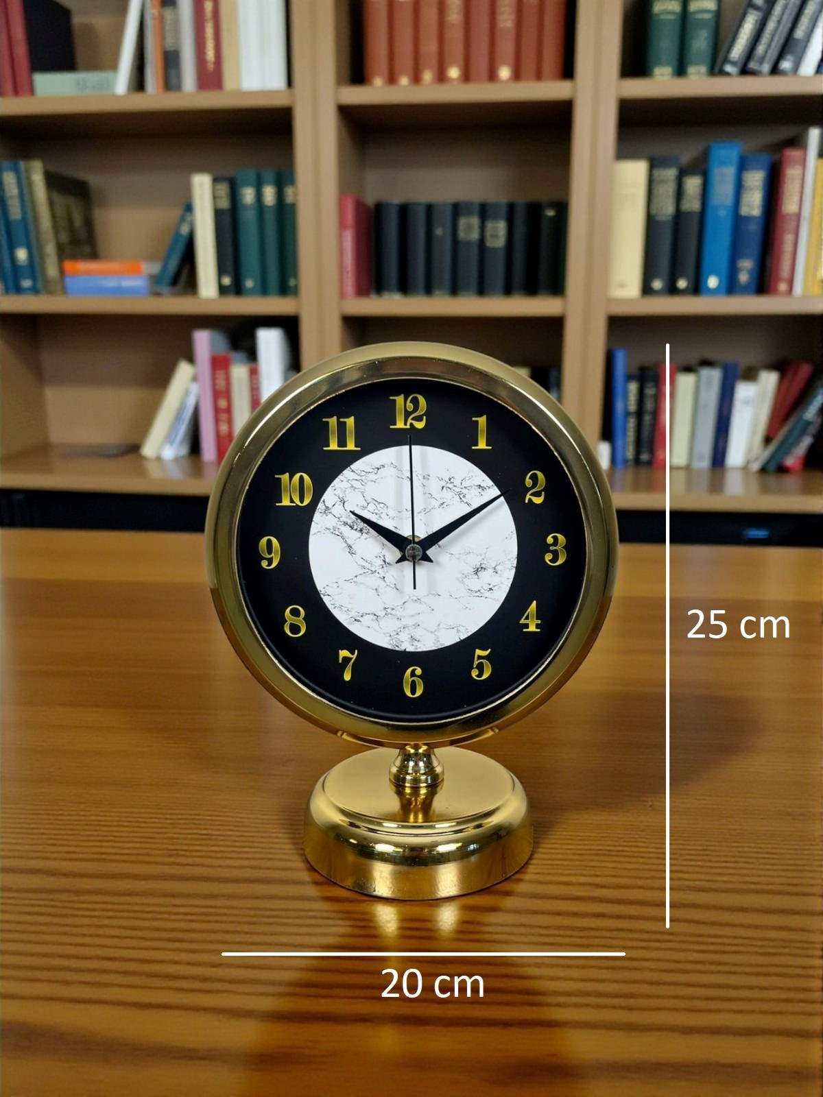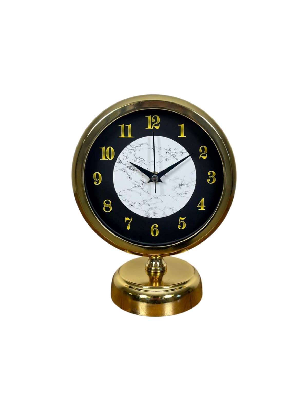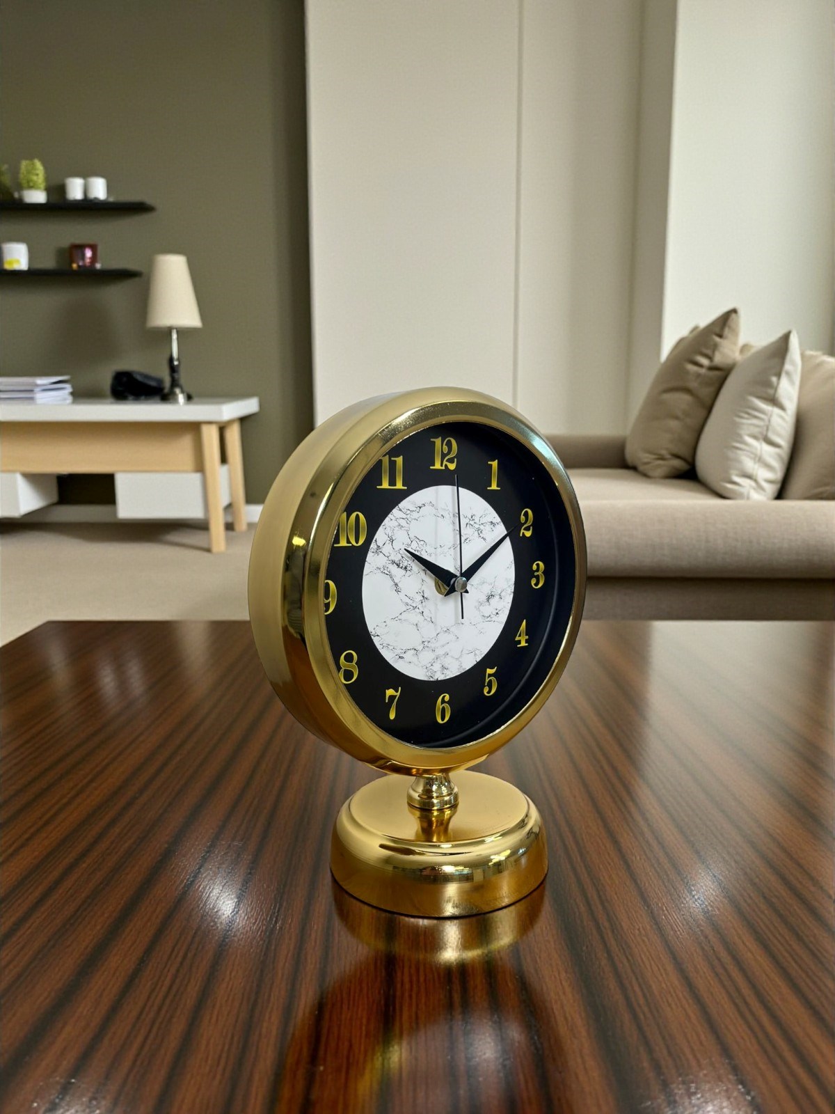 Dekorasyonda hem modern hem de sofistike bir etki arayanlar için tasarlanan bu gold masa saati, siyah zemin üzerindeki gold rakamları ve ortadaki mermer desenli şık detayıyla bulunduğu ortama hemen lüks bir hava katar. Gold gövdesi ışığı zarifçe yansıtırken, mermer dokusu saat tasarımına premium bir karakter kazandırır.