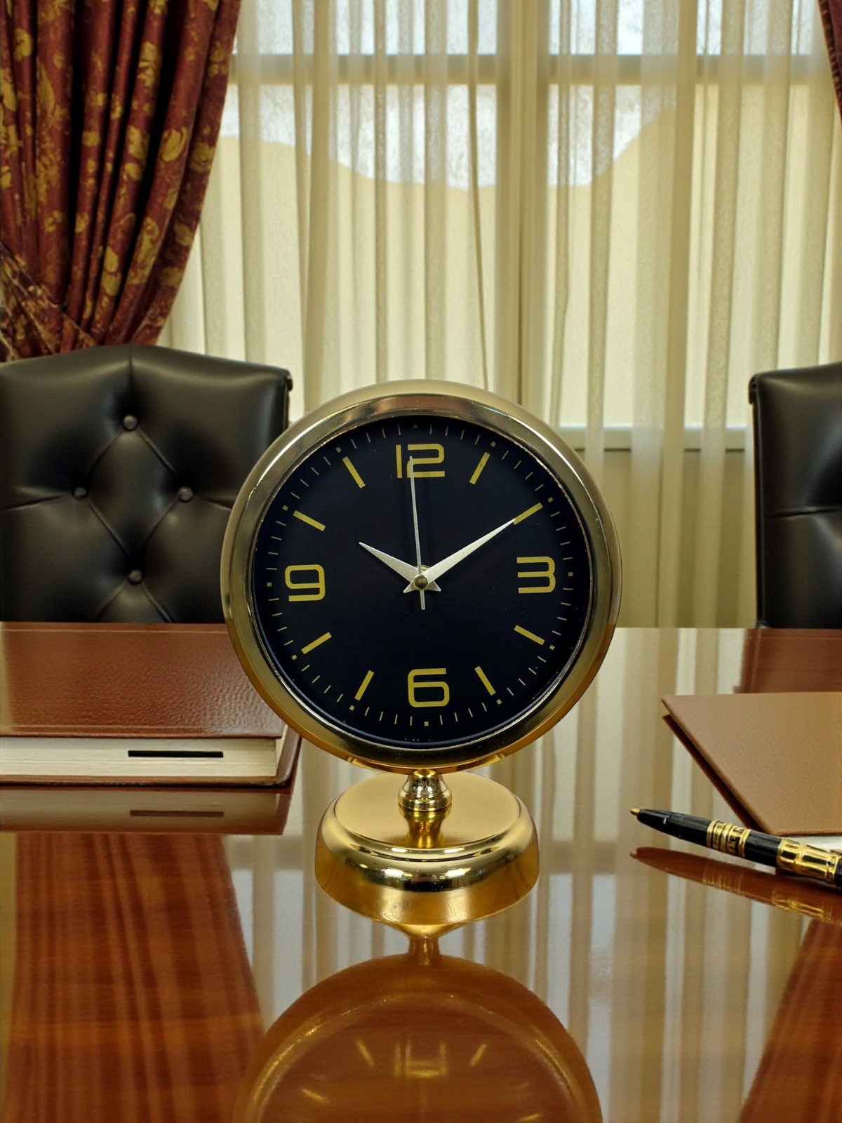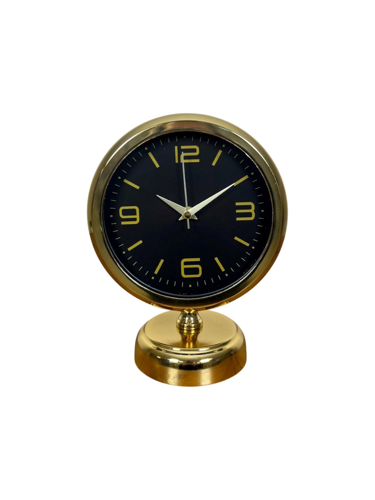Modern çizgileri klasik bir duruşla buluşturan bu gold masa saati, siyah kadranı ve gold detaylarıyla bulunduğu her ortamda prestijli ve şık bir atmosfer oluşturur. Gözü yormayan sade tasarımı sayesinde hem ev hem de ofis dekorasyonlarında rahatlıkla kullanılabilir. Çalışma masasında güçlü ve profesyonel bir görünüm sunarken, salon konsolu veya raf üzerinde dekoru tamamlayan zarif bir aksesuar olarak öne çıkar.