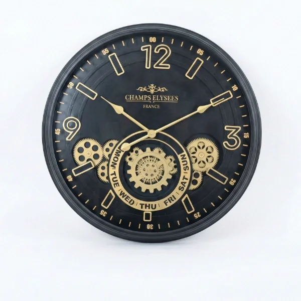 ÇARKLI DUVAR SAATİ ALTIN RENGİ DETAYLI 59 CMÜrün ÖzellikleriÇarklı duvar saati altın rengi detaylı 59 cm modeli, klasik saat estetiğini modern endüstriyel tasarım anlayışıyla birleştirerek yaşam alanlarına güçlü ve sofistike bir atmosfer kazandırır. Geniş 59 cm çapı sayesinde duvarda tek başına dikkat çekici bir dekoratif unsur olarak öne çıkar ve özellikle salon, ofis, kafe, restoran ve loft tarzı mekânlar için ideal bir tercih sunar. Siyah zemin üzerine işlenen altın rengi çark detayları, saate mekanik bir derinlik kazandırırken dekorasyonda lüks ve prestijli bir görünüm oluşturur. Büyük ve net rakam yapısı uzaktan rahatlıkla okunabilirlik sağlarken, altın tonlu akrep ve yelkovan tasarımı saatin genel estetiğini tamamlar. Sessiz akan mekanizması sayesinde çalışma alanlarında, dinlenme odalarında ve sosyal mekânlarda rahatsızlık yaratmadan konforlu kullanım sunar. Dayanıklı gövde yapısı uzun ömürlü kullanım için tasarlanmış olup duvara kolay monte edilebilir yapıdadır. Zamansız tasarımı ile hem klasik hem modern dekorasyon stillerine uyum sağlayarak mekânlara karakter kazandırır.Paket İçeriği1 adet çarklı duvar saati altın rengi detaylı 59 cm