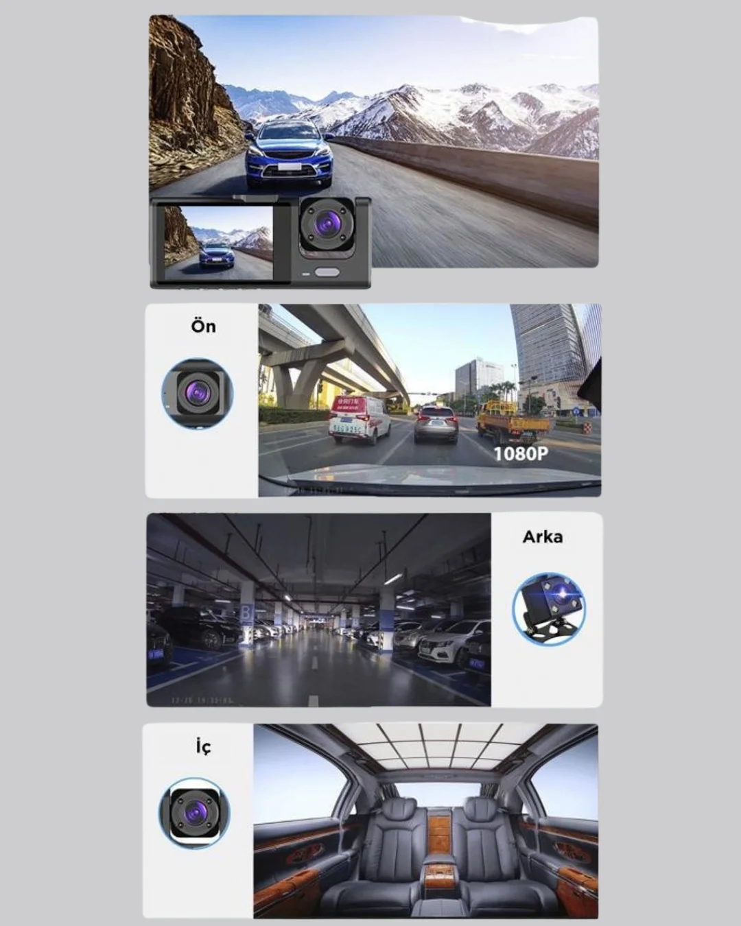 Her koşulda güvenilir kayıt imkanı sunan bu araç kamerası, üçlü kamera sistemi ile tüm sürüş anlarını kaydeder. Full HD ön kamera, HD çözünürlüklü iç ve arka kameralarla birlikte yüksek kaliteli görüntü elde etmenizi sağlar. Gece görüş fonksiyonu, düşük ışıklı ortamlarda bile netlik sunar. 170° geniş açılı lens, kör noktaları ortadan kaldırarak daha güvenli sürüş imkanı verir. G-sensör teknolojisi, darbeleri algılayarak önemli anları koruma altına alır. Park halindeyken hareket algılama özelliği aktif olur ve aracınızı izler. 2 inç ekranı ile görüntüleri anında izleyebilir, kolayca yönetebilirsiniz. 32 GB Micro SD kart desteği, uzun yolculuklarda bile kayıt kapasitesi sağlar. Suya ve toza dayanıklı yapısı cihazın ömrünü uzatır. Estetik ve kompakt tasarımıyla aracınıza şıklık katar. Sürüş güvenliği için eksiksiz bir çözümdür.