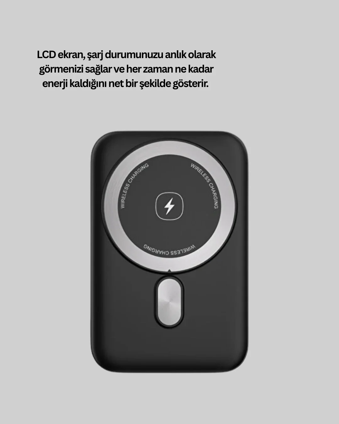 Bu LCD ekranlı taşınabilir powerbank, hem kablosuz hem de kablolu şarj imkânı sunarak maksimum kullanım esnekliği sağlar. Manyetik kablosuz şarj özelliği sayesinde uyumlu cihazlar tek hareketle şarj edilmeye başlanır.22.5W hızlı şarj teknolojisi, cihazlarınızı güvenli ve verimli şekilde kısa sürede doldurur. Type-C giriş modern şarj standartlarına uyum sağlarken USB çıkış, farklı cihazların da kolayca şarj edilmesine olanak tanır.Dijital ekran sayesinde şarj seviyesi her an net şekilde görülebilir. Taşınabilir boyutu ile seyahatlerde, işte veya günlük kullanımda rahatlıkla taşınabilir.