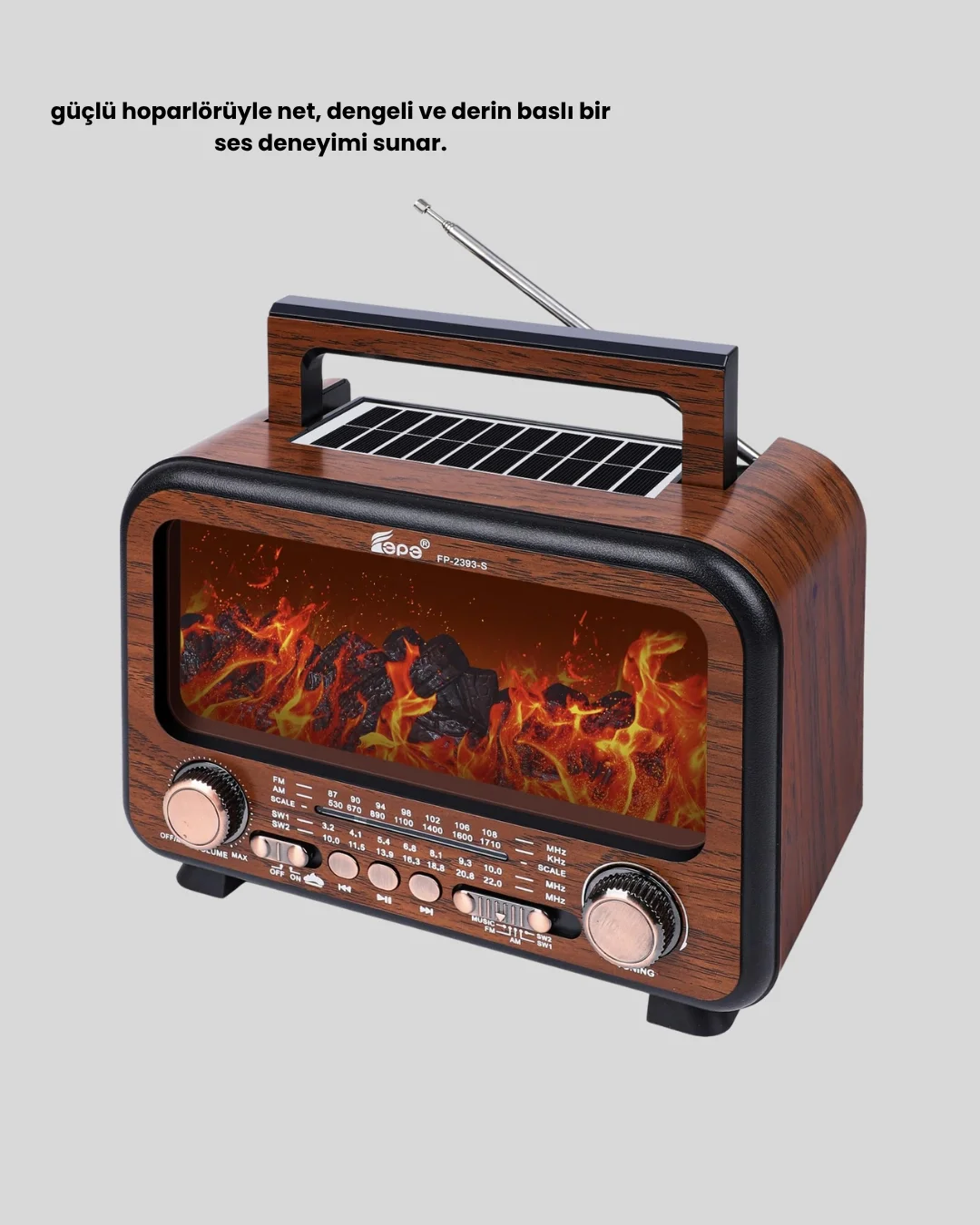 Bu solar şarjlı şömine efektli Bluetooth hoparlör, teknolojiyi estetikle buluşturan özel bir tasarıma sahiptir. Alev ışığı efekti, ortama romantik ve sıcak bir şömine atmosferi katarken, 7W gücündeki hoparlör güçlü ve kaliteli bir ses deneyimi sunar. Derin bas detayları ve net yüksek frekansları sayesinde hem müzik dinleme hem de radyo keyfini üst seviyeye taşır.Bluetooth 5.3 teknolojisi, cihazla hızlı eşleşme sağlar ve 10 metreye kadar stabil bir bağlantı sunar. Bağlantı kopmalarını minimum seviyeye düşüren bu teknoloji sayesinde müziğiniz kesintiye uğramaz. Solar şarj özelliği ise özellikle doğada vakit geçiren kullanıcılar için vazgeçilmezdir. Güneş enerjisiyle şarj olabilir, elektrik kaynağı olmadan uzun süre kullanım sağlar. Ek olarak 18650 tip şarj edilebilir pil, cihazın çalışma süresini uzatır.USB, TF kart, AUX ve radyo desteği sayesinde farklı medya seçenekleri sunar. FM/AM/SW radyo modunda anteni uzatarak net frekans alabilirsiniz. Bu çok yönlü medya seçenekleri hoparlörü yalnızca bir müzik cihazı olmaktan çıkarıp çok işlevli bir eğlence aracına dönüştürür.Dış mekan kullanımı için tasarlanan dayanıklı plastik gövde, darbeye ve çevresel koşullara karşı dayanıklıdır. Taşınabilir yapısı ve taşıma kolu sayesinde kamp, bahçe, teras, plaj gibi alanlarda kolayca kullanılabilir. Hem iç mekân hem dış mekân için dekoratif bir aksesuar niteliği taşır.Dahili mikrofon özelliği ile gelen çağrıları cevaplayabilir, hoparlör üzerinden net bir şekilde konuşabilirsiniz. Şık tasarımı, nostaljik şömine efekti ve güçlü solar şarj özelliğiyle bu hoparlör, hem ambiyans hem de performans arayan kullanıcılar için mükemmel bir seçimdir.