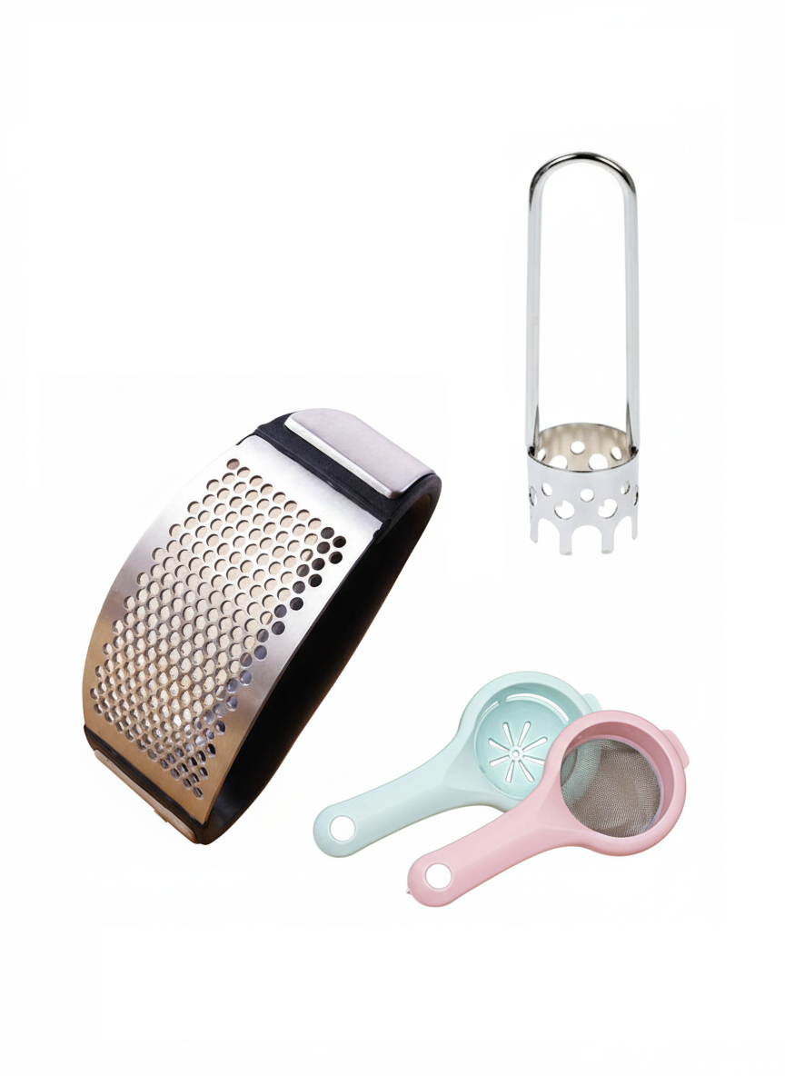 Sarımsak ezici, biber & kabak oyacağı, yumurta akı ayırıcı ve 2’li çay süzgeci ile yemek hazırlığı artık hızlı ve zahmetsiz. Dayanıklı, paslanmaz ve kolay temizlenir. Mutfakta zaman kazanın, lezzeti artırın!