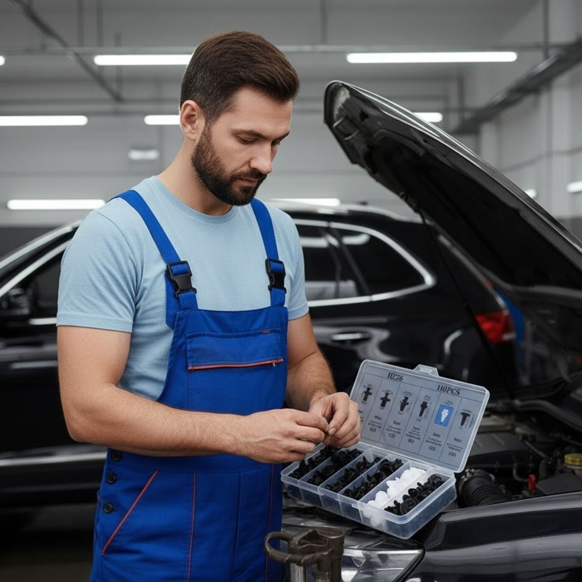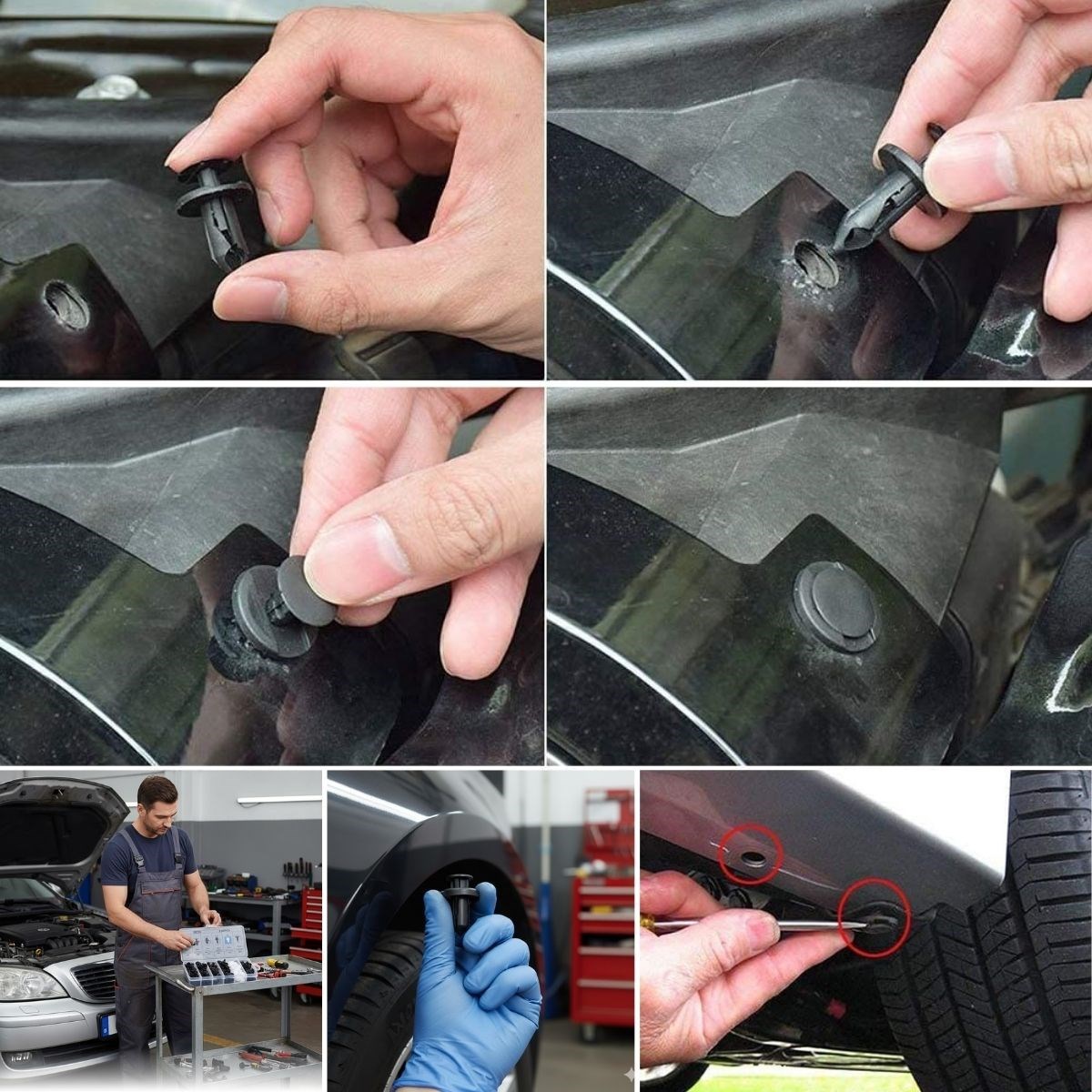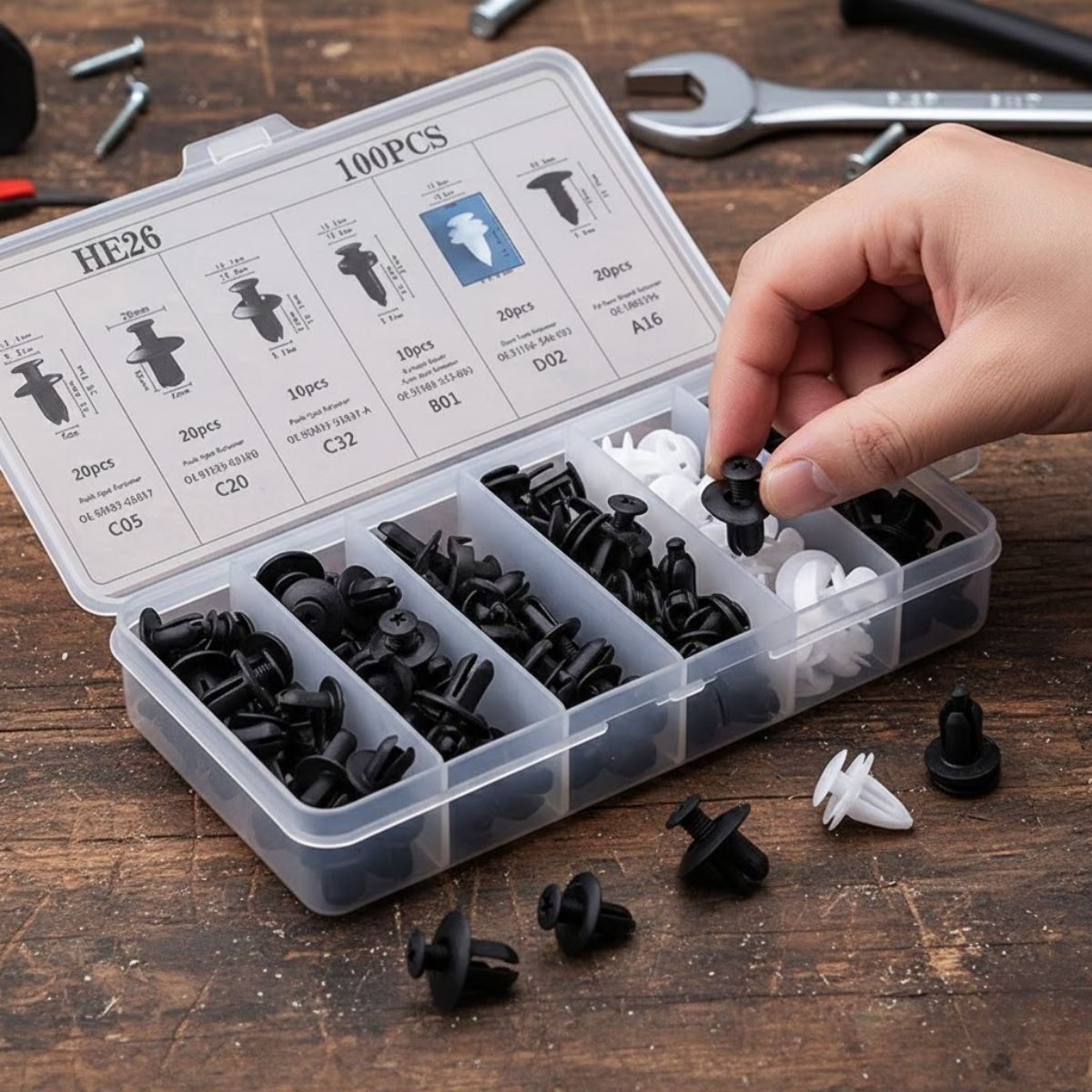 Araç bakım ve onarım işlemlerinde pratik, düzenli ve güvenilir bir çözüm sunan Plastik Bağlantı Elemanları Seti, farklı ölçü ve tiplerde 100 adet oto klipsi ve plastik perçin içeriğiyle çok amaçlı kullanım imkânı sağlar. Tampon, kapı döşemesi ve trim parçalarının sabitlenmesi için idealdir.