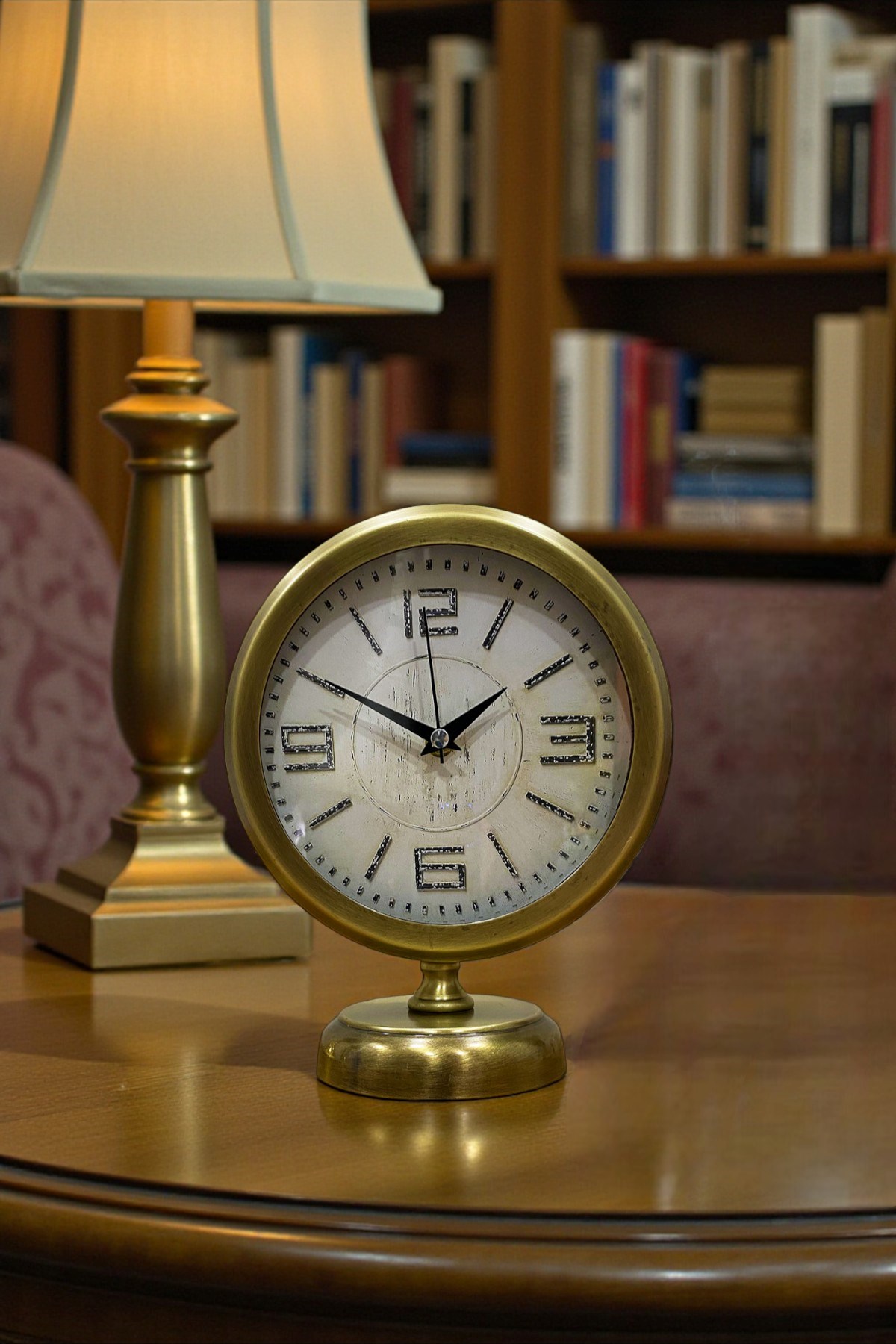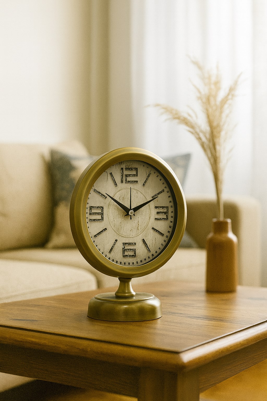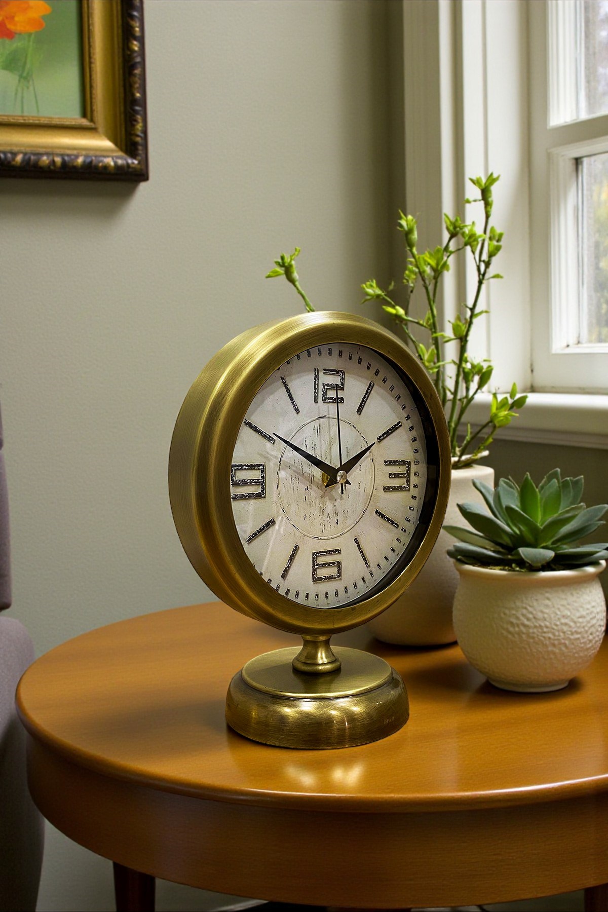 Zarif detayları ve klasik tasarımıyla öne çıkan bu eskitme vintage masa saati, nostaljik ruhu modern yaşam alanlarıyla buluşturur. Krem tonlu kadranı üzerinde yer alan büyük ve karakterli rakamlar, saatin okunabilirliğini artırırken estetik bir duruş sunar. Eskitme efektli metal çerçevesi ve dengeli tabanı sayesinde bulunduğu ortamda güçlü bir dekoratif obje olarak öne çıkar.