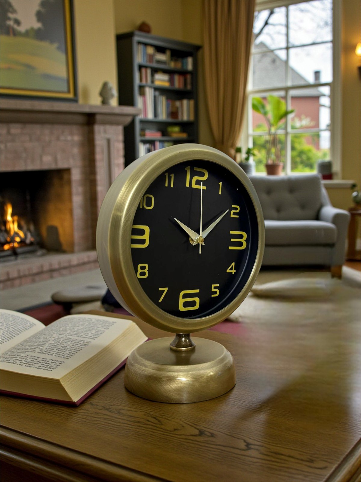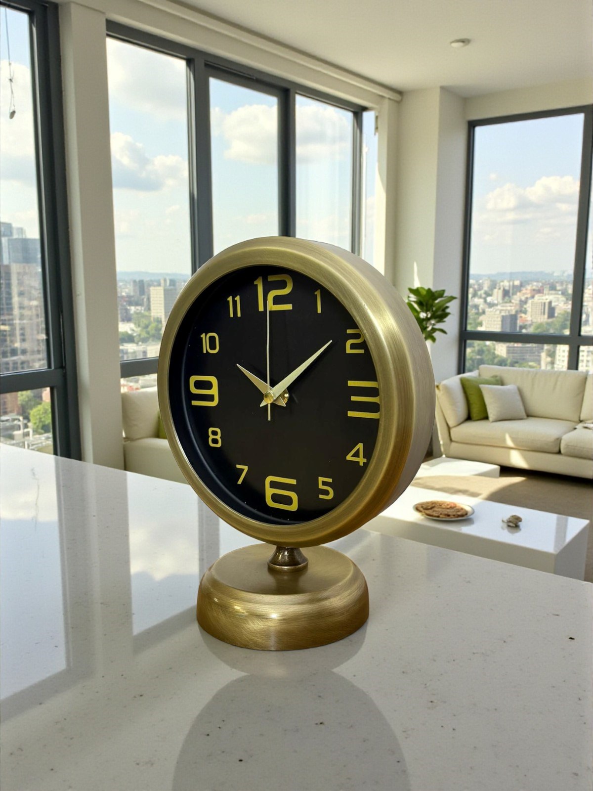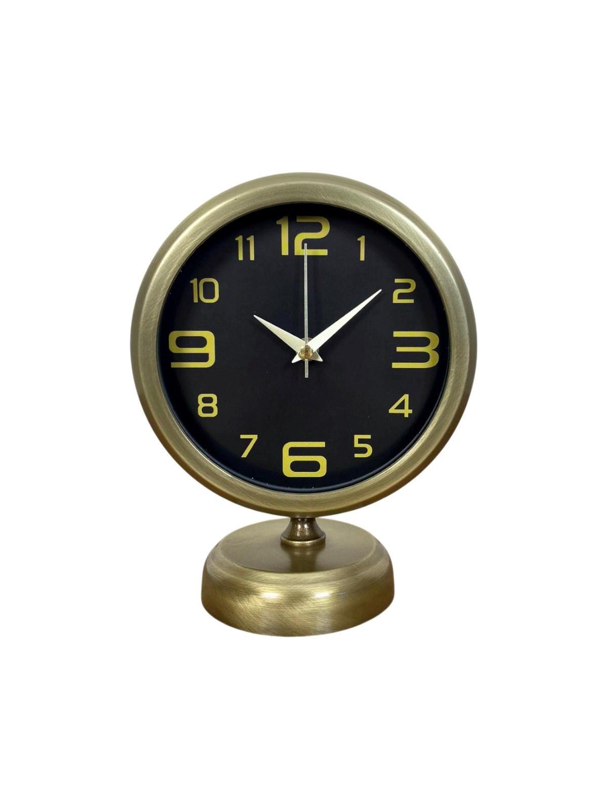 Klasik saat tasarımını modern bir yorumla sunan bu eskitme masa saati, güçlü duruşu ve dikkat çekici detaylarıyla bulunduğu ortama karakter kazandırır. Siyah kadranı üzerinde yer alan büyük ve gold tonlu rakamlar, saatin okunabilirliğini artırırken lüks ve retro bir görünüm sunar. Eskitme metal gövdesi sayesinde vintage tarzı sevenler için vazgeçilmez bir dekoratif tamamlayıcıdır.