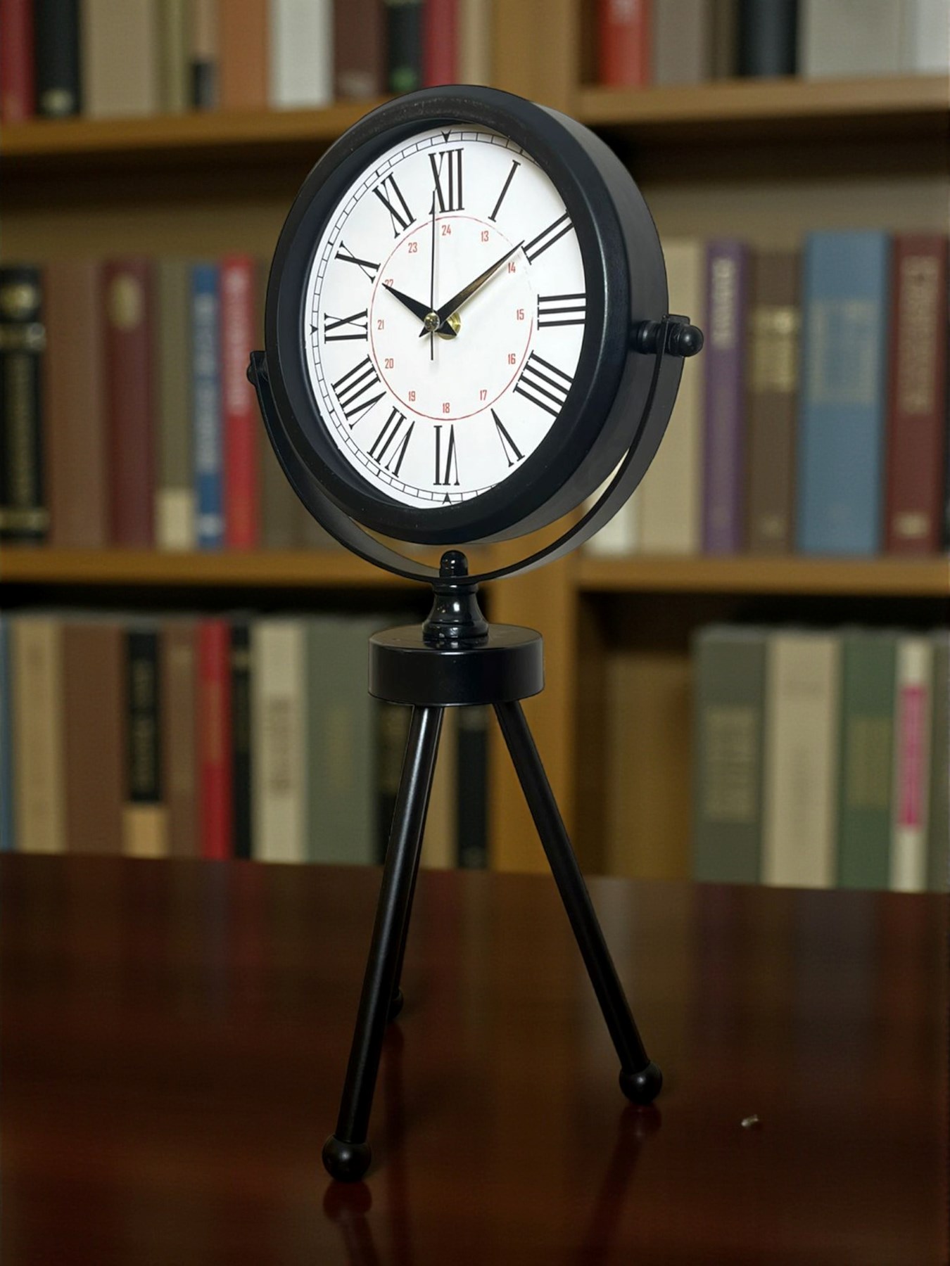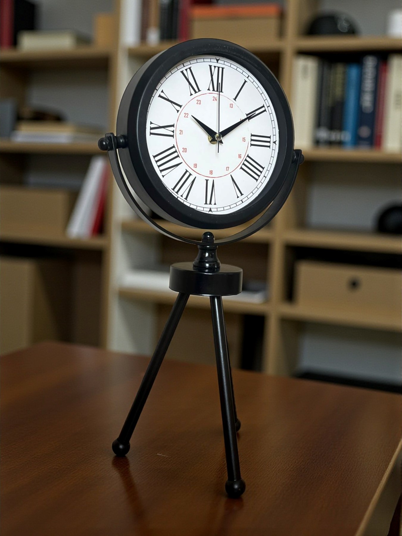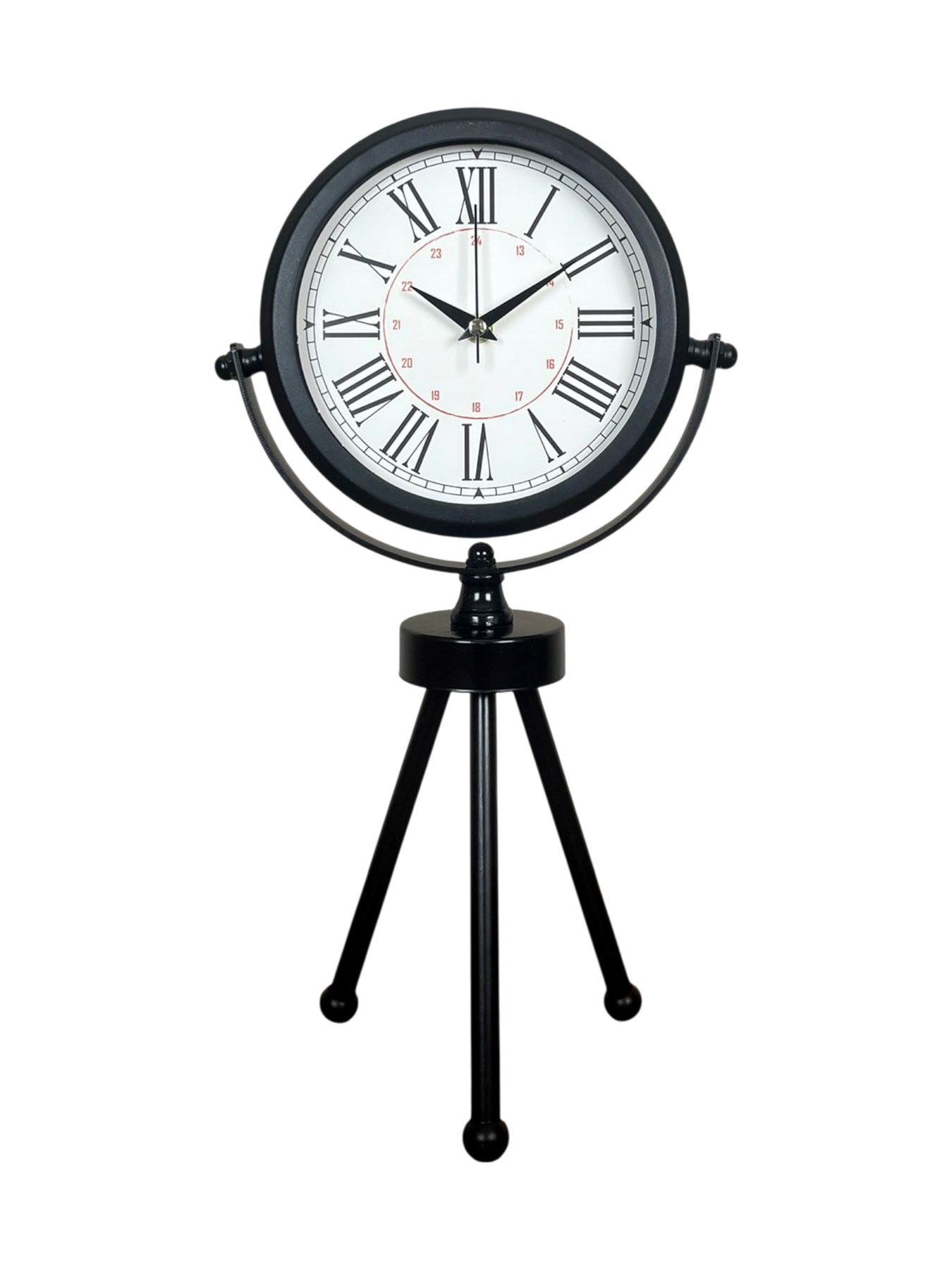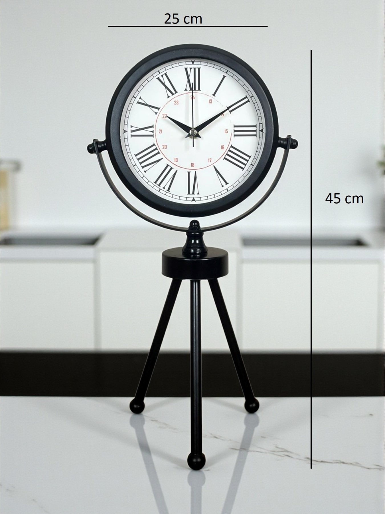 45 x 25 cm ölçülerindeki bu modern siyah üç ayaklı masa saati, minimal tasarımı ve güçlü duruşuyla her ortama şıklık katar. Gerçek cam korumalı kadranı sayesinde net görüntü ve uzun ömürlü kullanım sağlar. Tamamen metal gövdesi ve tripod ayak yapısıyla sağlam, dekoratif ve premium bir görünüm sunar. Sessiz akar saniye mekanizmasıyla ev, ofis ve çalışma alanlarında rahatsızlık vermeden kullanılabilir.