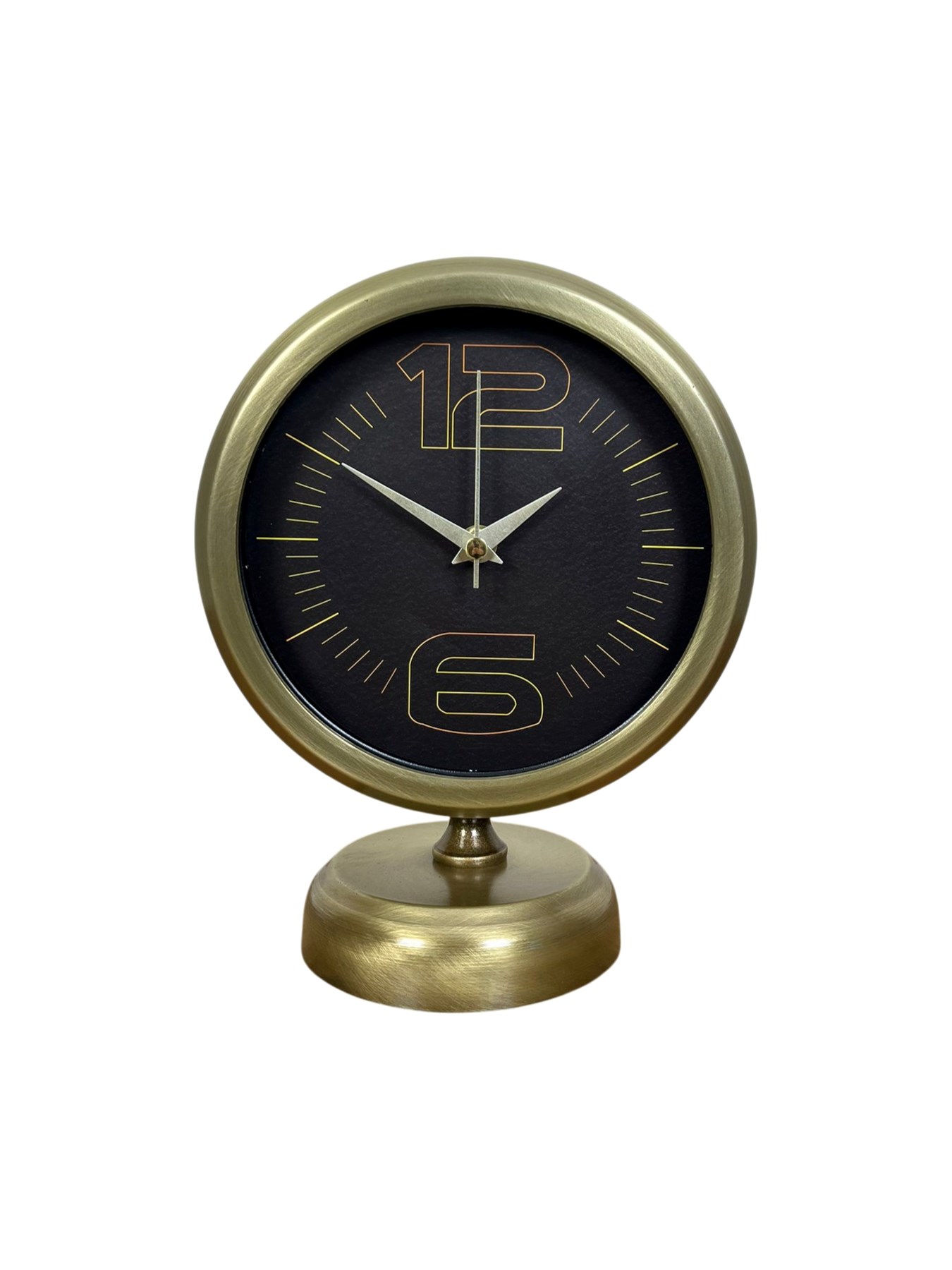 Zamansız tasarımı ve eskitme gold dokusuyla öne çıkan bu masa saati, klasik ve modern dekorasyonu aynı potada buluşturur. Kompakt ölçüleri sayesinde masa, konsol, kitaplık, ofis masası veya vitrin üzerinde rahatlıkla kullanılabilir. Siyah kadran üzerinde yer alan gold detaylar saate güçlü bir karakter kazandırırken, dekorasyona sofistike bir dokunuş ekler.