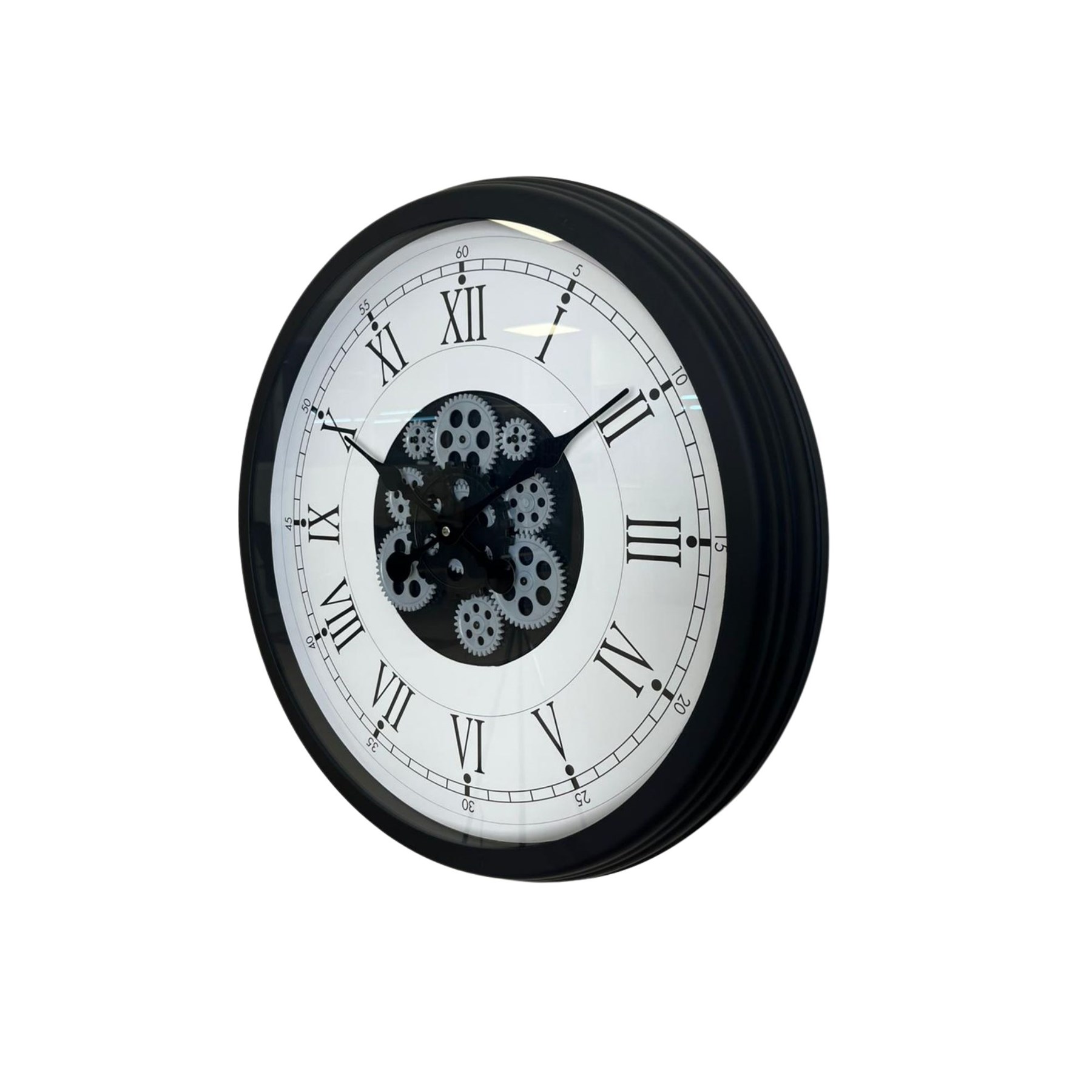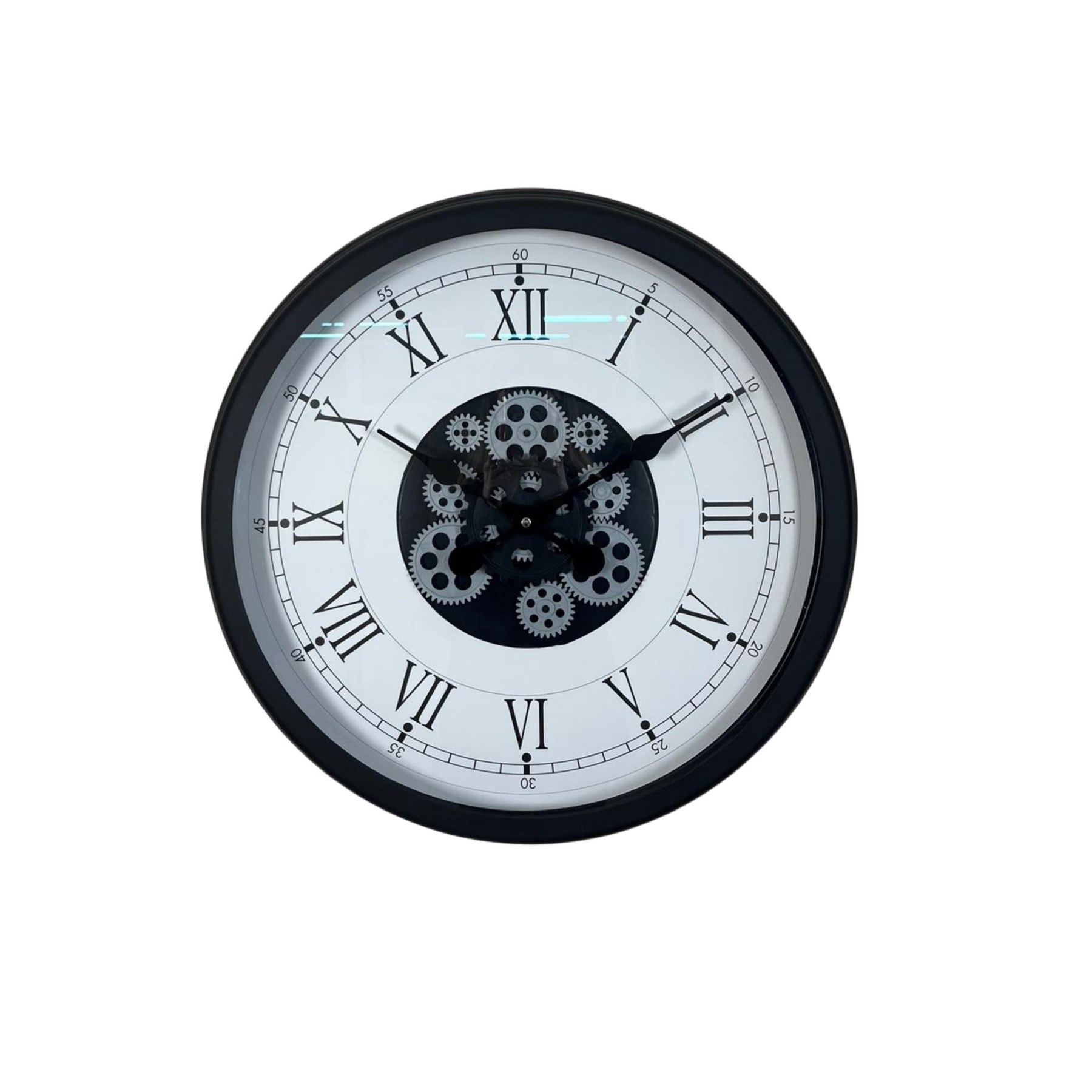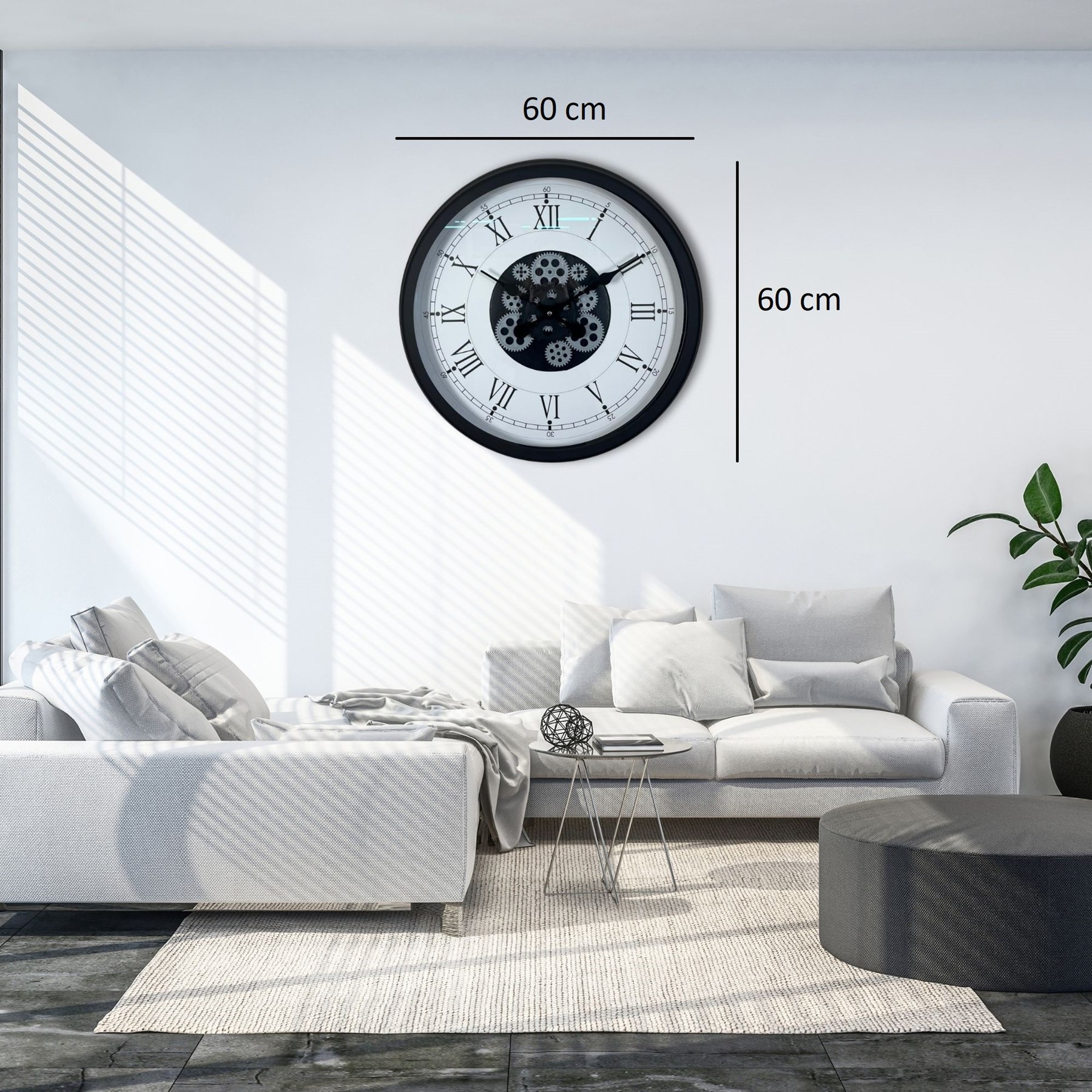 Zamansız Roma rakamları, güçlü siyah kasası ve merkezde yer alan hareketli çark mekanizmasıyla tasarlanan bu 60 cm duvar saati; klasik ve modern dekorasyonu kusursuz şekilde birleştirir. Büyük çapı sayesinde duvarda dolu ve gösterişli bir görünüm oluşturur.