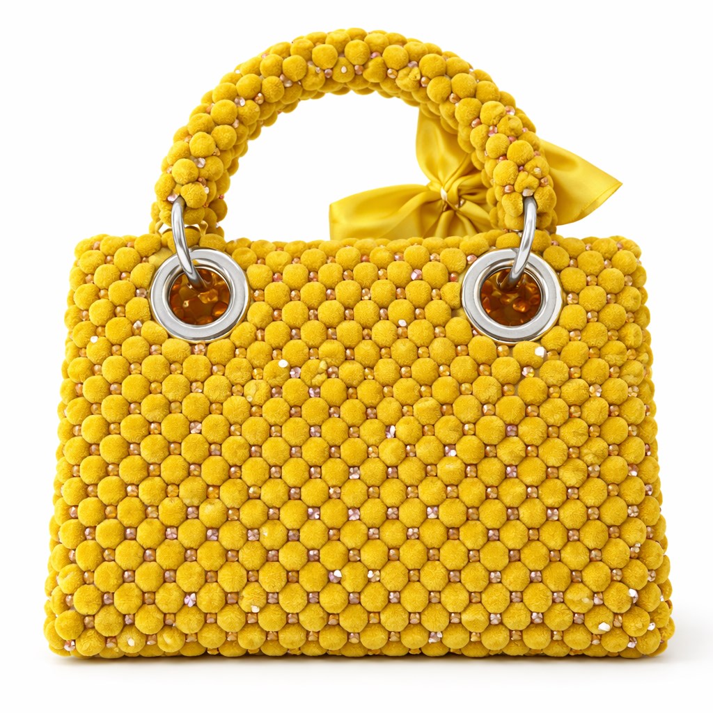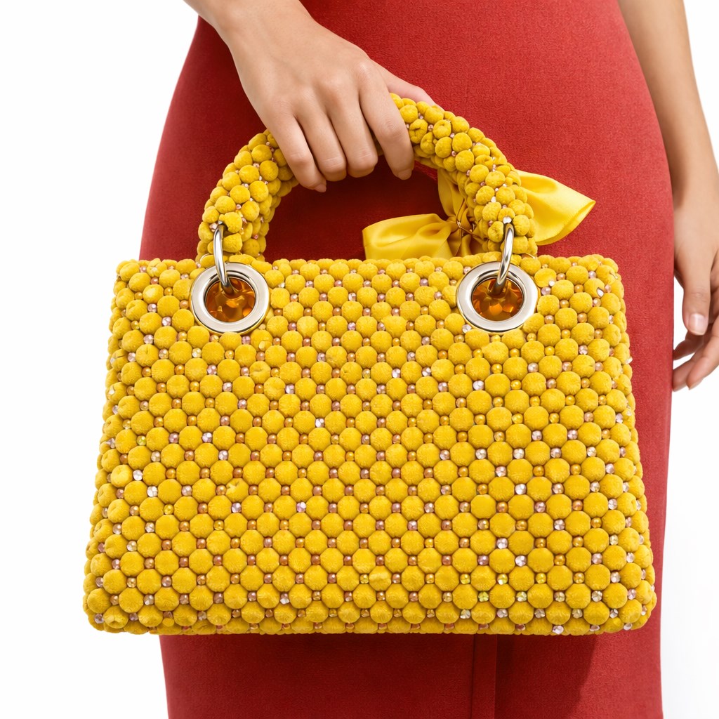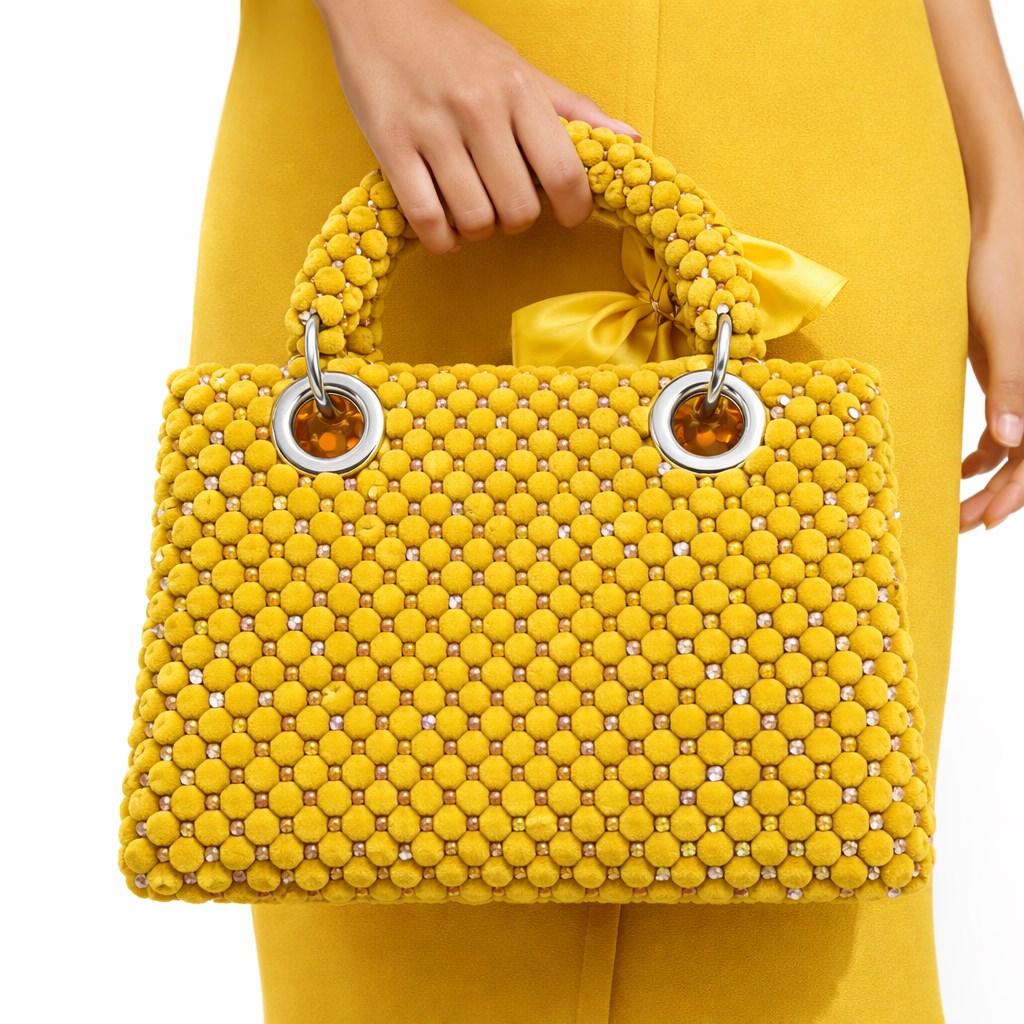 Silva Mimosa’nın strüktürü, boncukların birbirine kilitlenen örgü düzeni sayesinde dikişsiz ve kesintisiz bir yüzey bütünlüğü sunar. Boncuk aralarındaki mikro boşluklar, yüzeyde doğal bir derinlik ve ritim oluşturarak tasarıma organik ama kontrollü bir karakter kazandırır. Bu yoğun örgü, çantaya heykelsi bir hacim verirken, couture seviyesinde bir işçilik algısı yaratır.