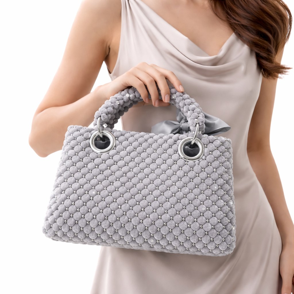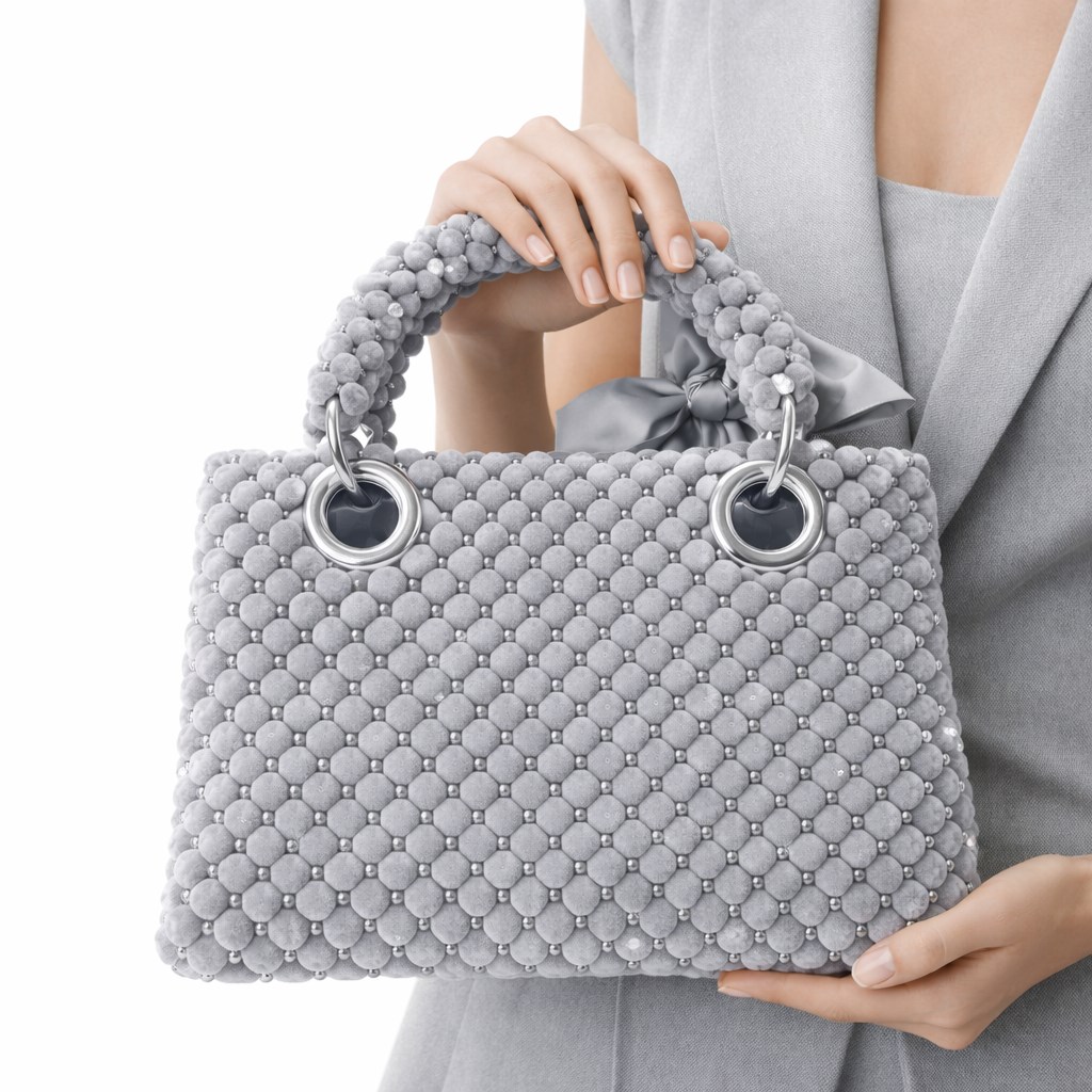Silva Titanium’ın strüktürü, boncukların birbirine kilitlenen örgü düzeni sayesinde dikişsiz ve kesintisiz bir yüzey bütünlüğü sunar. Boncuk aralarındaki mikro boşluklar, yüzeyde doğal bir derinlik ve ritim oluşturarak tasarıma organik ama kontrollü bir karakter kazandırır. Bu yoğun örgü, çantaya heykelsi bir hacim verirken, couture seviyesinde bir işçilik algısı yaratır.