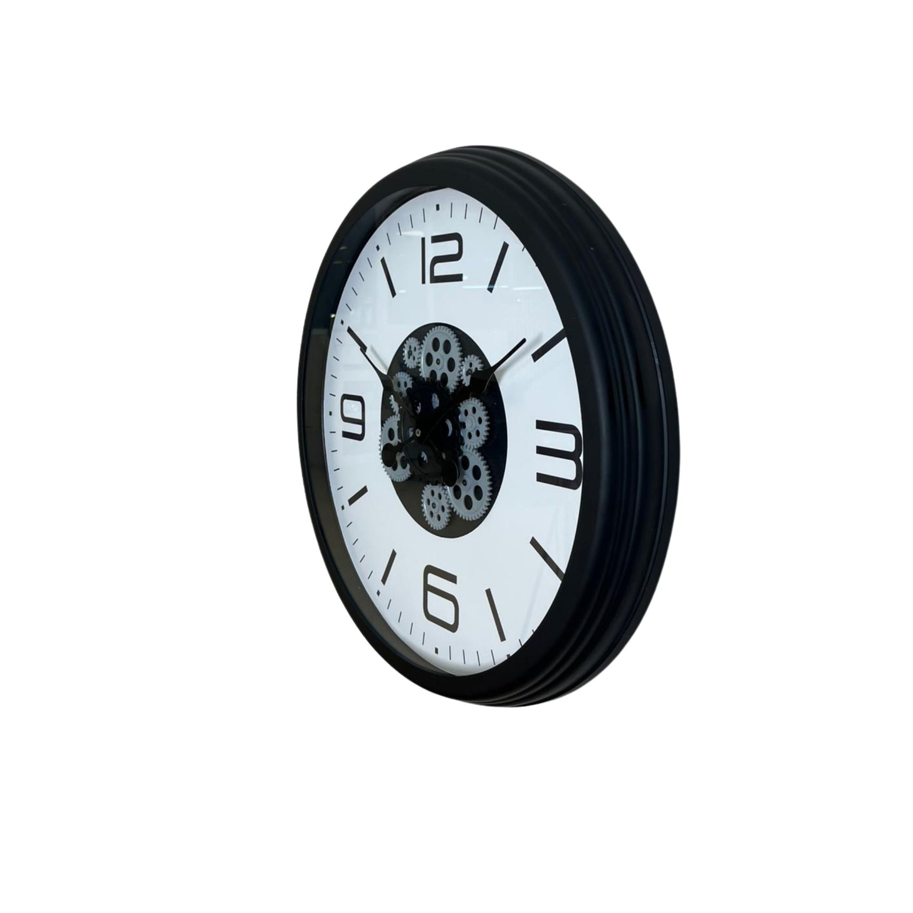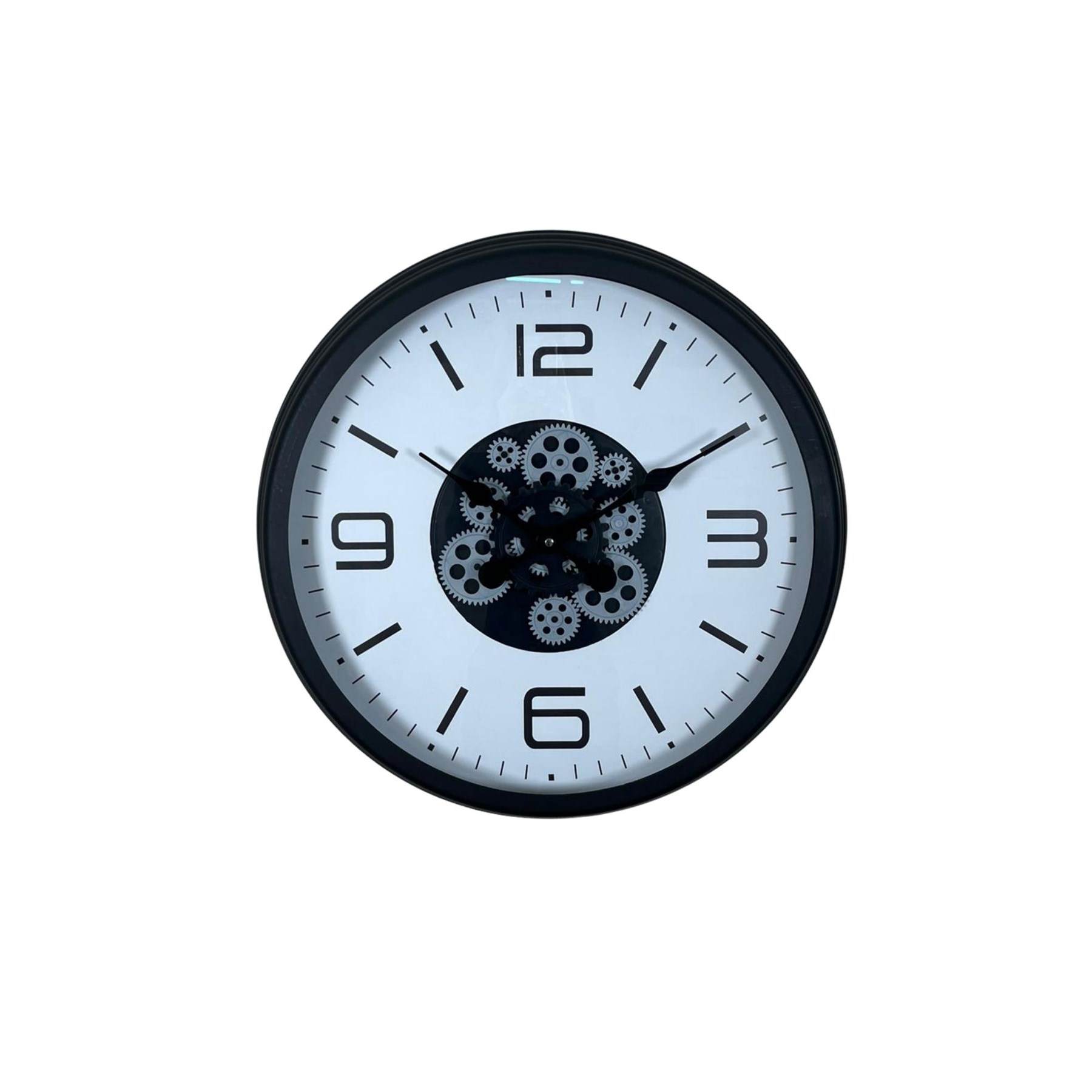 Saatin merkezinde yer alan dekoratif hareketli çark mekanizması tasarıma dinamik bir hava katarken, sade beyaz zemin ve siyah detaylar sayesinde zamansız bir şıklık sunar.