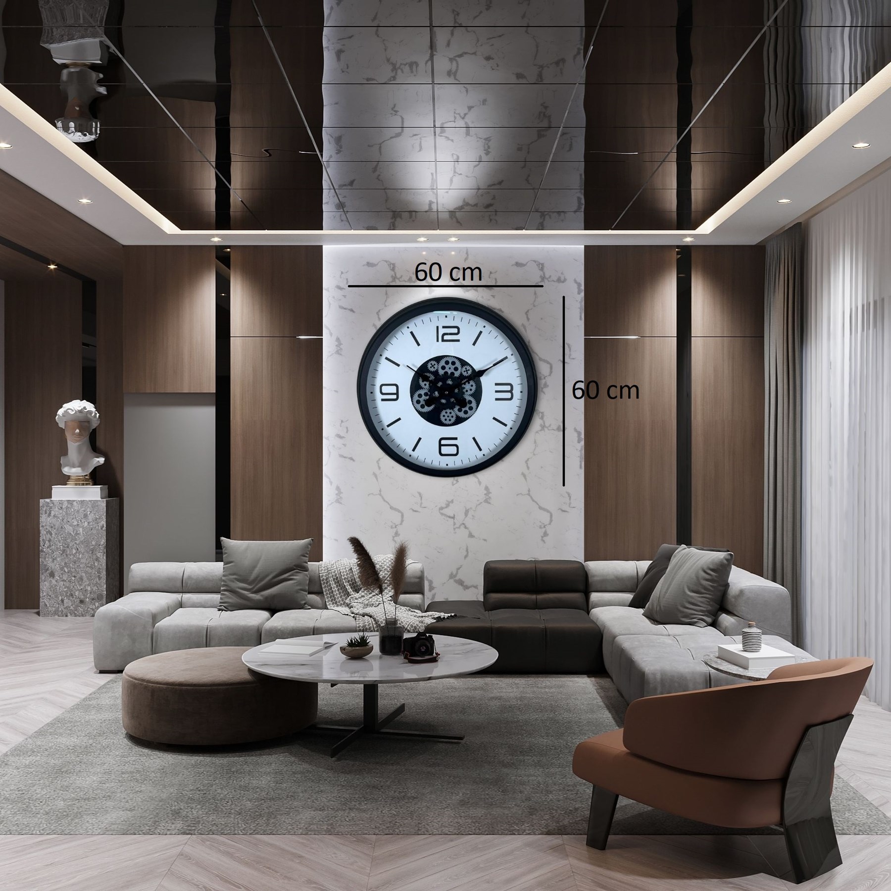 Minimalist siyah çerçevesi, net ve büyük rakamları ile tasarlanan bu 60 cm çarklı duvar saati; modern, endüstriyel ve çağdaş dekorasyon tarzına mükemmel uyum sağlar. Geniş çapı sayesinde bulunduğu ortamda güçlü ve dikkat çekici bir görünüm oluşturur.