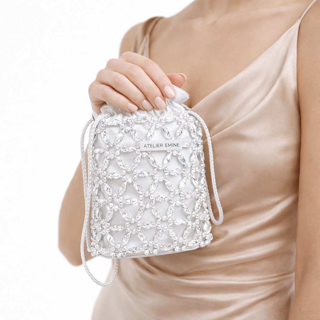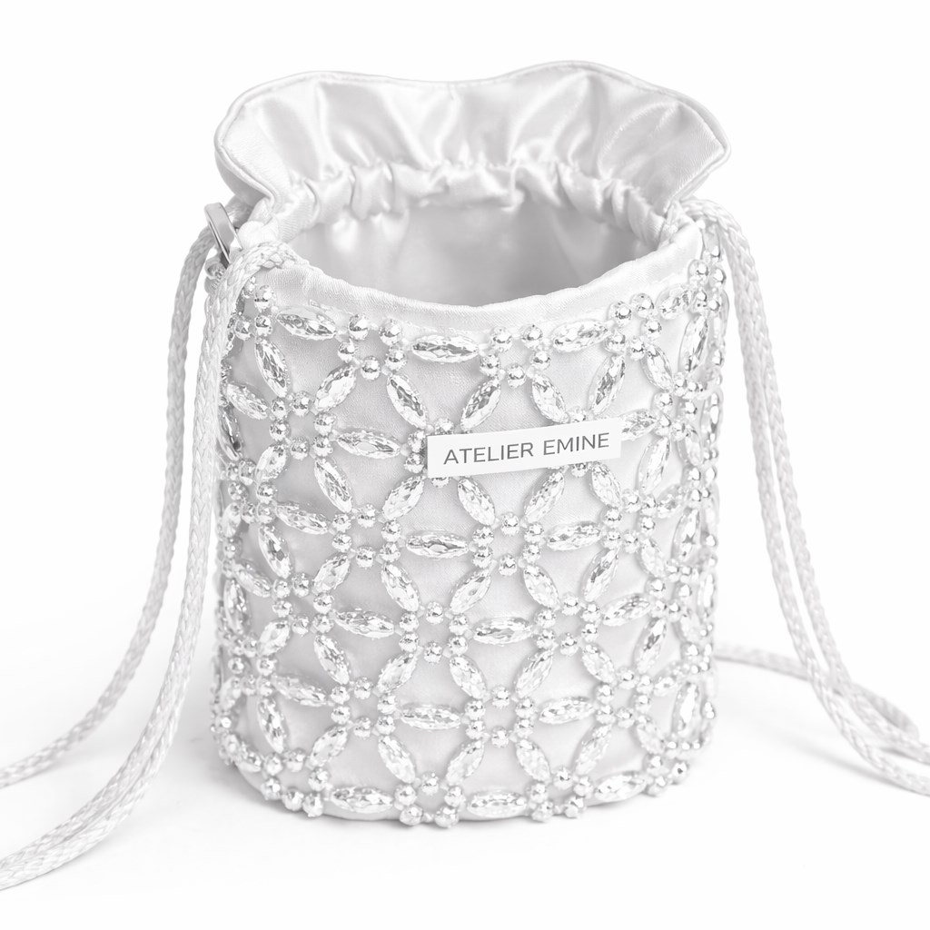 Atelier Emine’in Crystal Gelato Couture serisine ait Sorbetto Rice, 8 mm optik sınıfı kristal boncukların yüksek dayanımlı misina ile file örgü tekniğinde birleştirilmesiyle tamamen el işçiliğiyle üretilmiş, yumuşak hacimli ancak kontrollü form yapısına sahip premium mini pouch çanta modelidir.