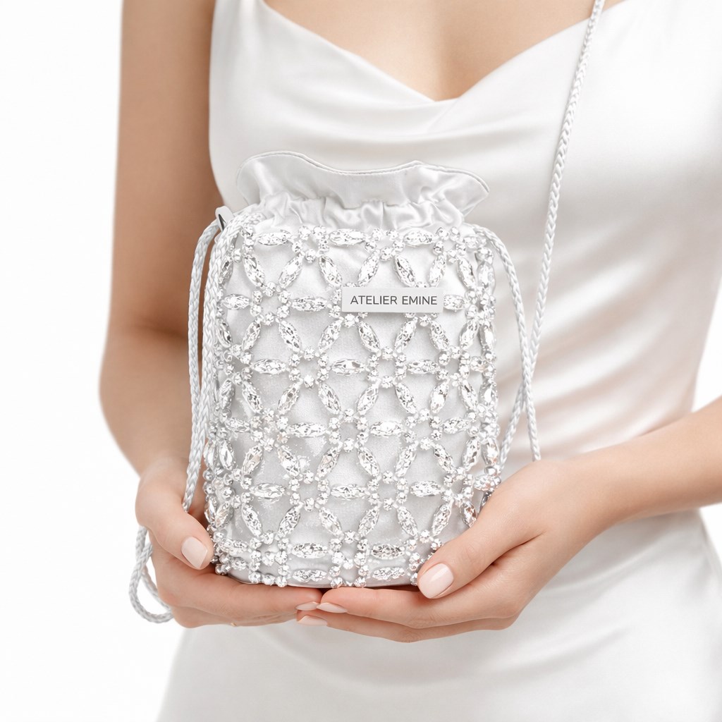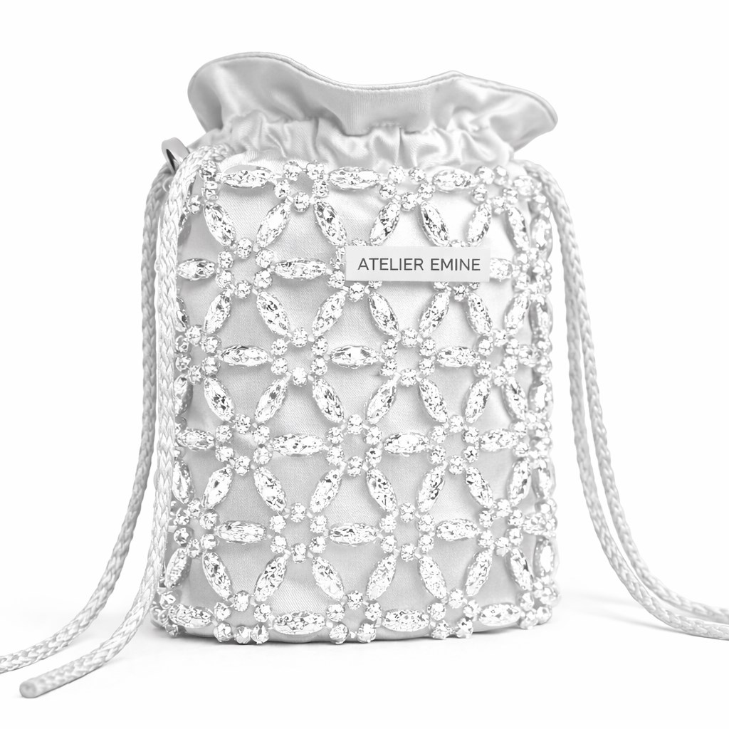 Ön yüzeyde yer alan Atelier Emine marka plakası, kristal örgü dokuyu bölmeden, minimal ve dengeli bir konumlandırmayla entegre edilmiştir. Sorbetto Rice, yumuşak hacmi, el işçiliği yoğun örgü yapısı ve couture detay yaklaşımıyla Crystal Gelato Couture koleksiyonunun daha akışkan ve feminen karakterli parçalarından biridir.