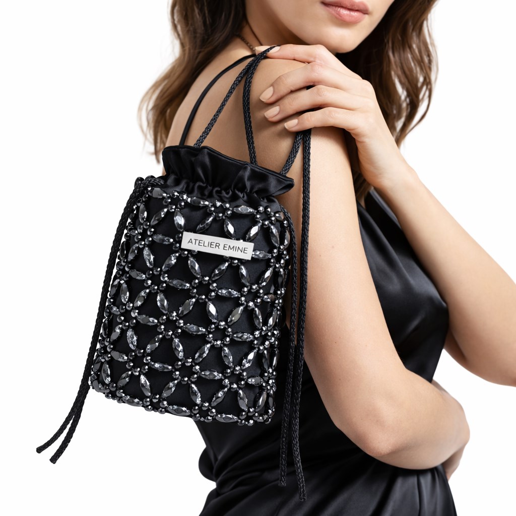 Atelier Emine’in Crystal Gelato Couture serisine ait Sorbetto Rogue, 8 mm optik sınıfı kristal boncukların yüksek dayanımlı misina ile file örgü tekniğinde birleştirilmesiyle tamamen el işçiliğiyle üretilmiş, yumuşak hacimli ancak kontrollü form yapısına sahip premium mini pouch çanta modelidir.