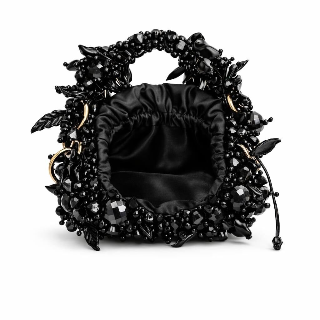 Gövde yapısı, farklı kesim ve hacimlerde kristal boncukların yüksek dayanımlı misina ile tek tek örülmesiyle oluşturulmuş; yüzey boyunca kontrollü düzensizlik prensibiyle ilerleyen üç boyutlu bir doku elde edilmiştir. Bu teknik, çantaya ışık altında canlı fakat doğal bir kırılma etkisi kazandırırken, yüzeyde monotonluğu kıran couture düzeyinde bir derinlik sunar.