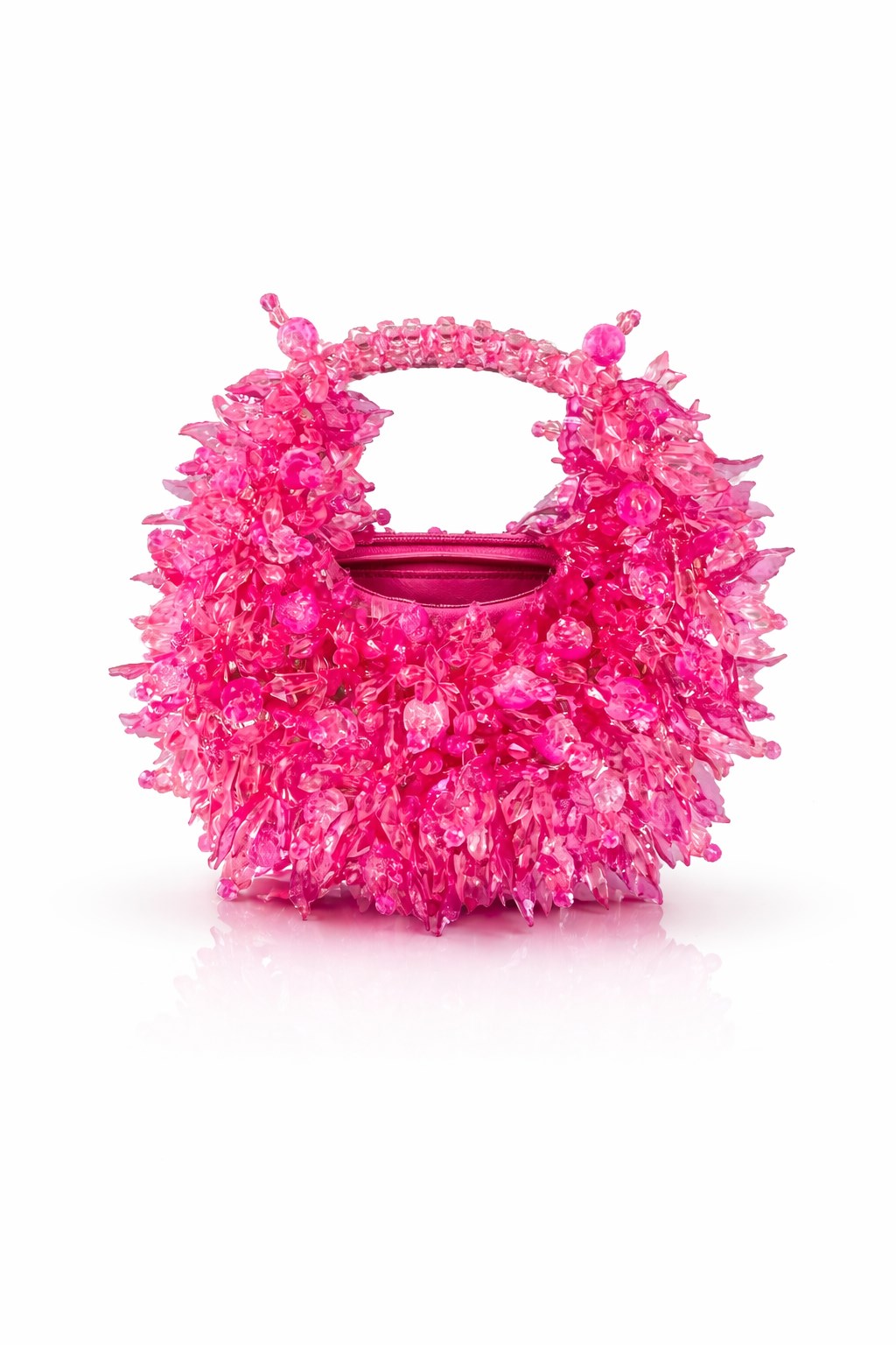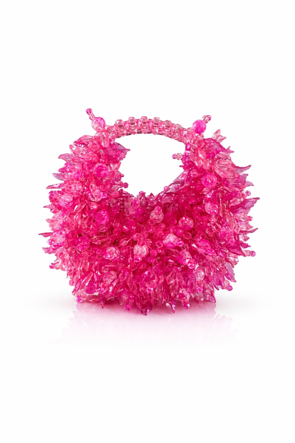 Bu modelin gövdesi, düzenli dizilimlerden bilinçli biçimde kaçınılarak; iğnemsi, yaprak benzeri ve parçalı kristal formların farklı açılarla üst üste bindirilmesiyle oluşturulmuştur. Kristaller, yüzeyde tek bir düzlem oluşturmak yerine, dışa doğru patlayan ve içe doğru çöken mikro hacimler üretir. Bu yapı, çantaya mercan benzeri, organik ve neredeyse canlı bir doku kazandırır.