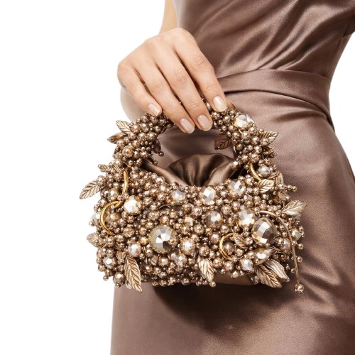 Gövde yapısı, farklı kesim ve hacimlerde kristal boncukların yüksek dayanımlı misina ile tek tek örülmesiyle oluşturulmuş; yüzey boyunca kontrollü düzensizlik prensibiyle ilerleyen üç boyutlu bir doku elde edilmiştir. Bu teknik, çantaya ışık altında canlı fakat doğal bir kırılma etkisi kazandırırken, yüzeyde monotonluğu kıran couture düzeyinde bir derinlik sunar.
