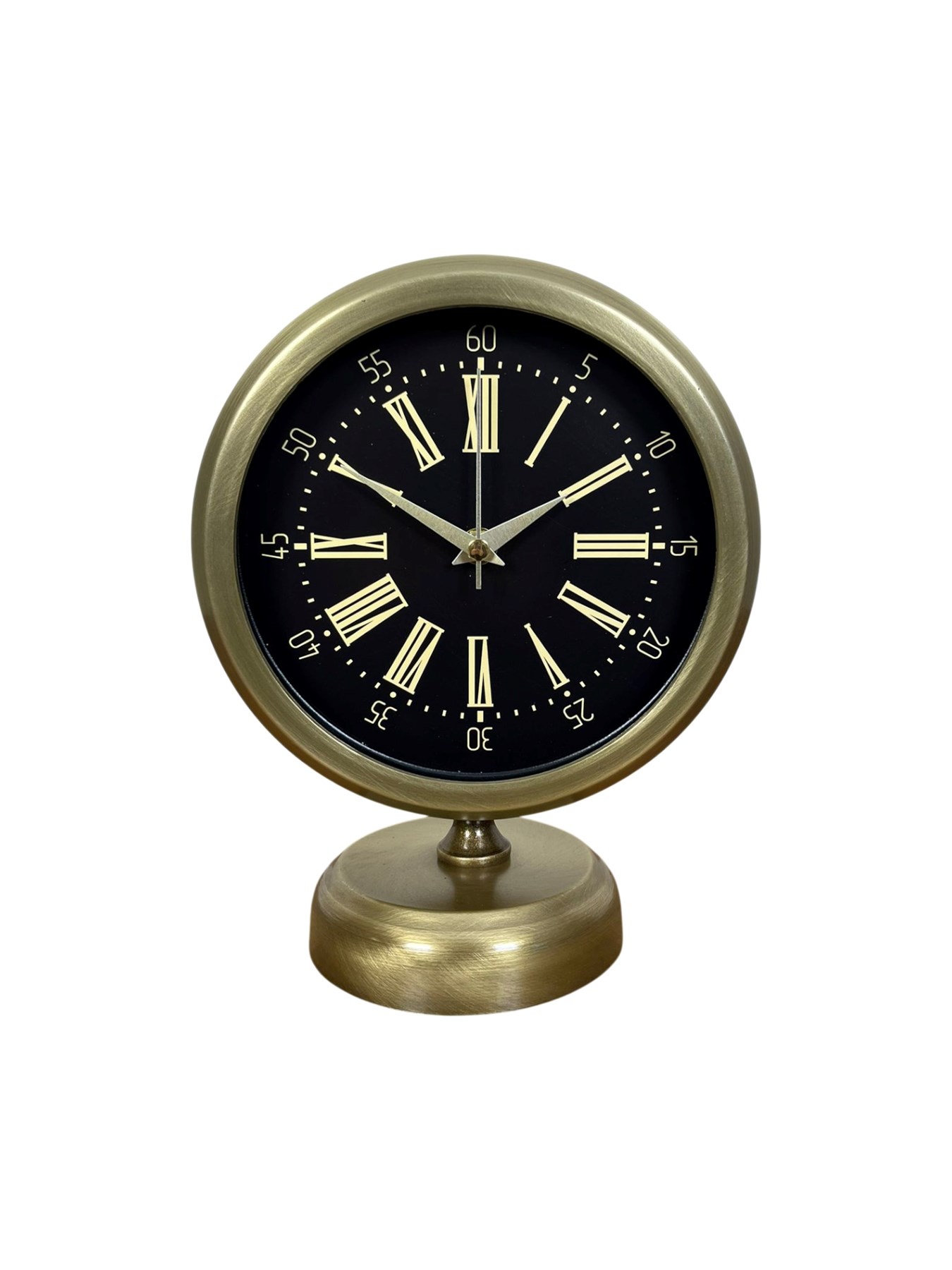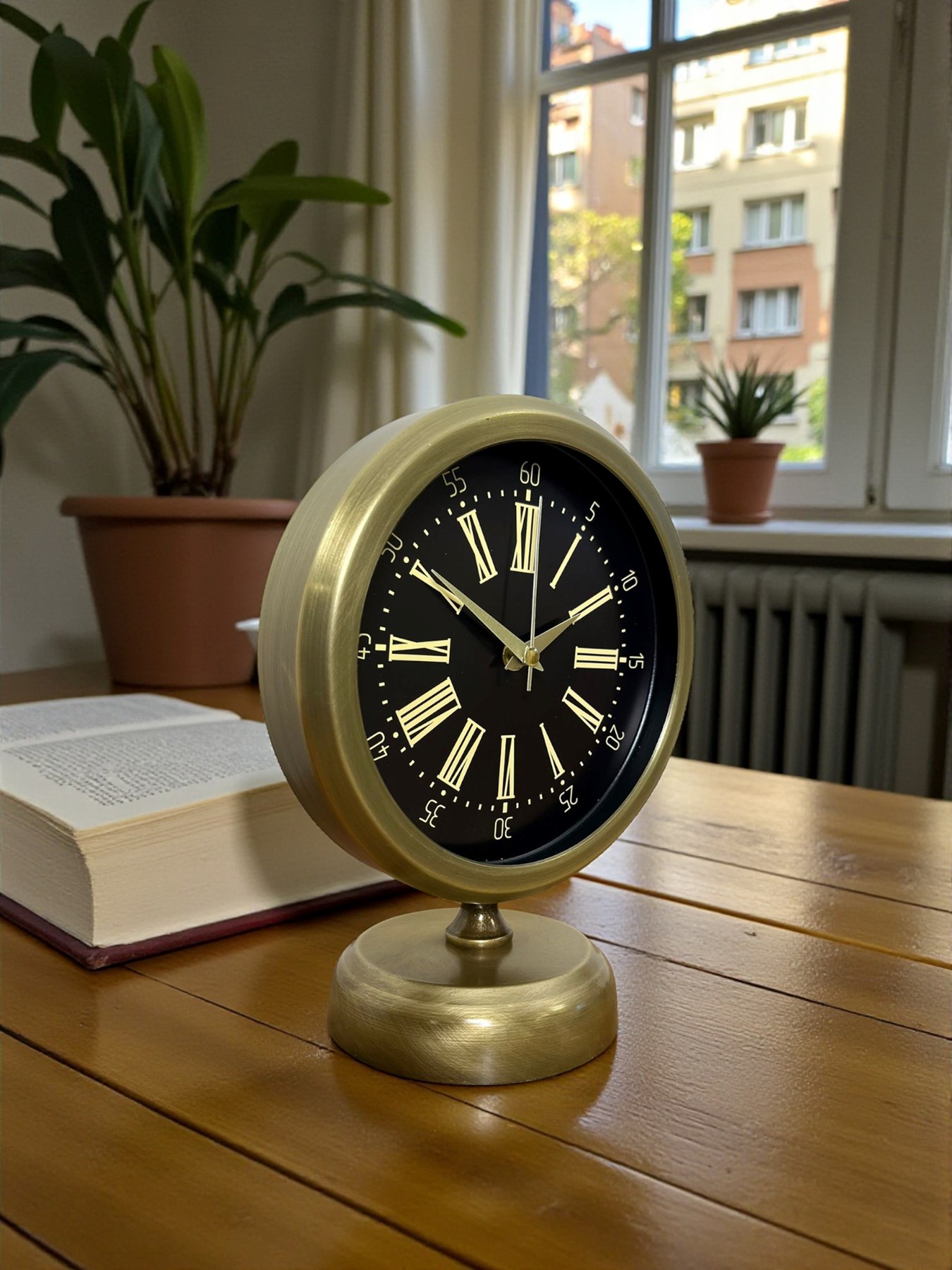 Klasik saat estetiğini modern dokunuşlarla buluşturan bu eskitme vintage masa saati, siyah kadranı ve gold tonlu Roma rakamlarıyla güçlü, asil ve dikkat çekici bir görünüm sunar. Eskitme metal çerçevesi, saate nostaljik bir karakter kazandırırken aynı zamanda dekorasyonda lüks ve zamansız bir duruş sağlar.