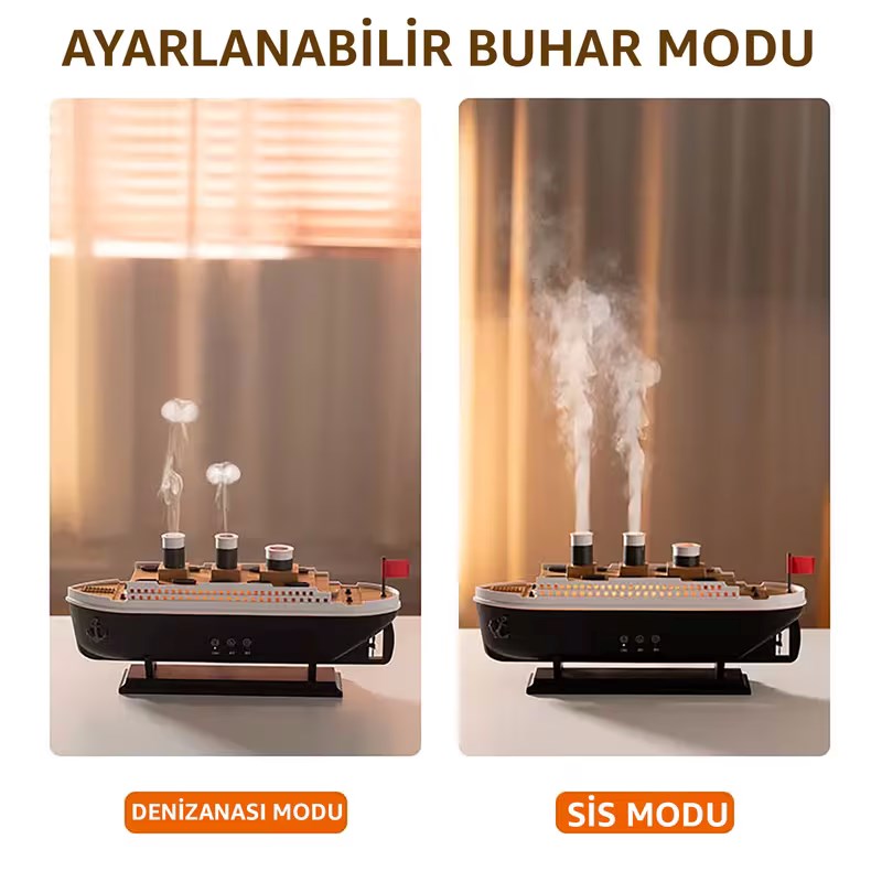 Titanic Aromaterapi Hava Nemlendirici, benzersiz gemi tasarımı ile hem şık bir dekoratif ürün hem de etkili bir hava nemlendiricidir. Bu difüzör, evinizde veya ofisinizde kuru hava problemini azaltarak daha sağlıklı bir ortam yaratmanıza yardımcı olur.
