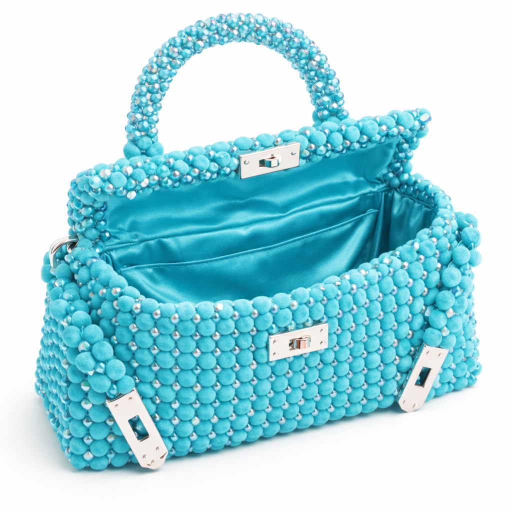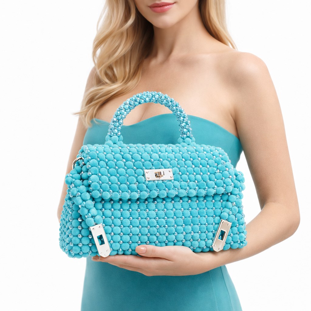Gövde formu, kadife boncuk örgünün doğal akışını koruyacak şekilde dengelenmiş; aynı zamanda kristal boncukların ağırlığını taşıyabilmesi için içten yapısal destekle güçlendirilmiştir. Misina örgü tekniği sayesinde çanta yüzeyi dikişsiz, kesintisiz ve heykelsi bir bütünlük sunar.