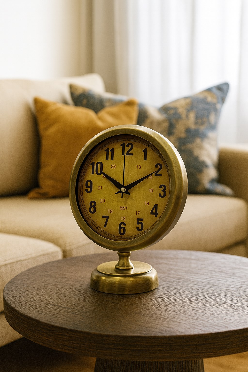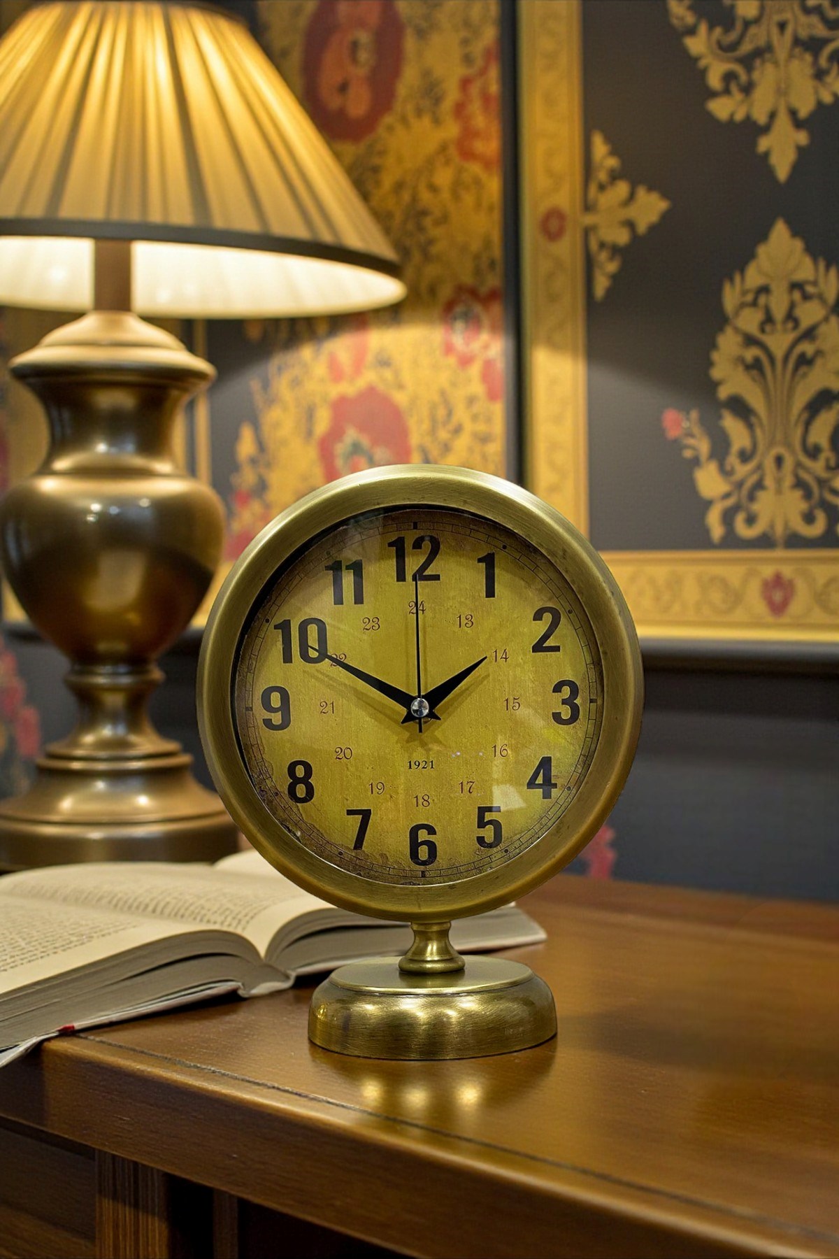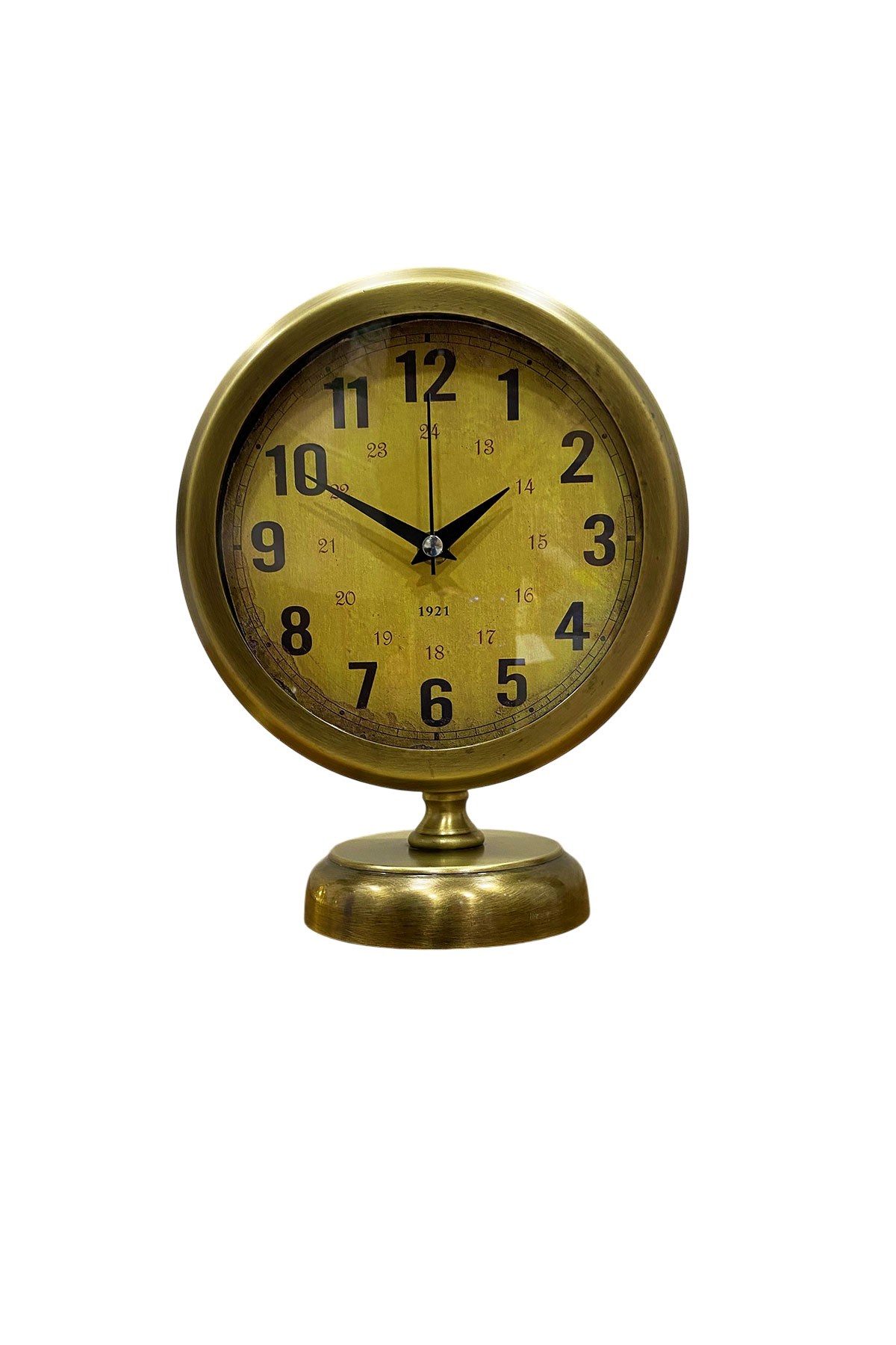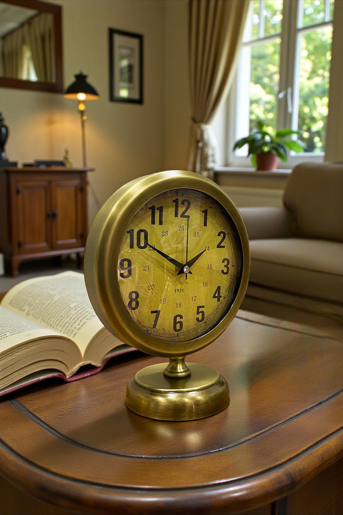 Klasik saat tasarımından ilham alan bu eskitme vintage masa saati, özel kadran yapısı ve 24 saat göstergesiyle diğer masa saatlerinden ayrılır. Sarı tonlu eskitme kadranı, siyah rakamları ve retro detayları sayesinde nostaljik bir görünüm sunarken; zamansız tasarımıyla bulunduğu ortama karakter kazandırır.
