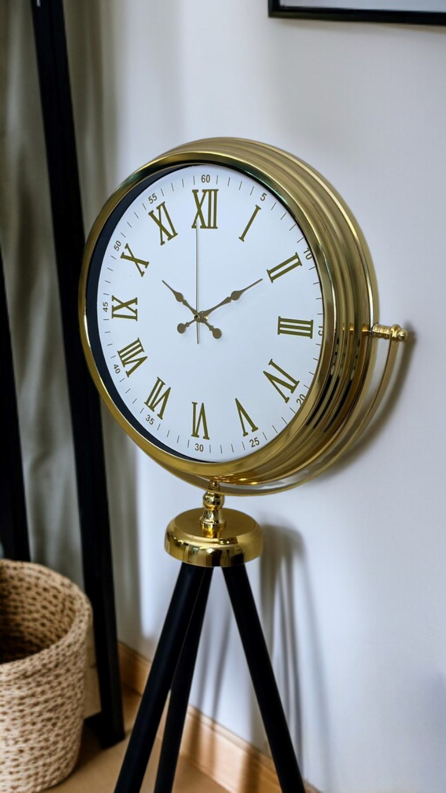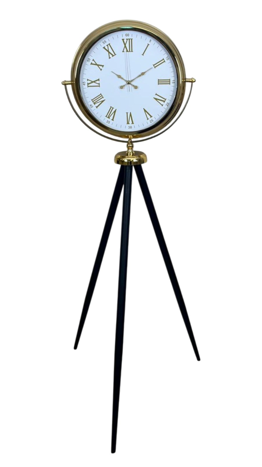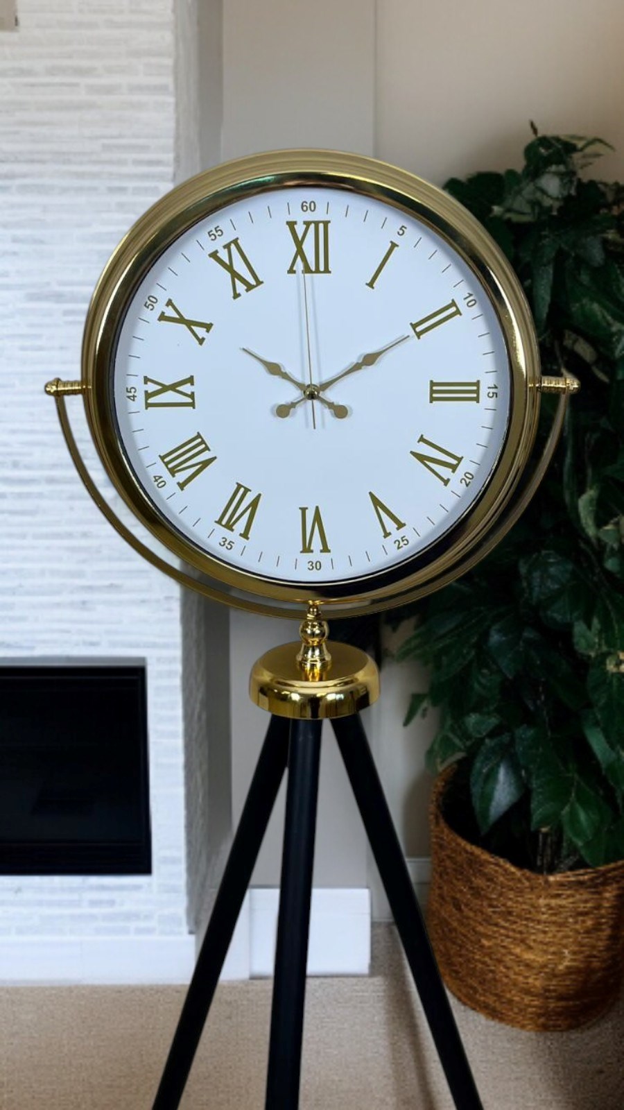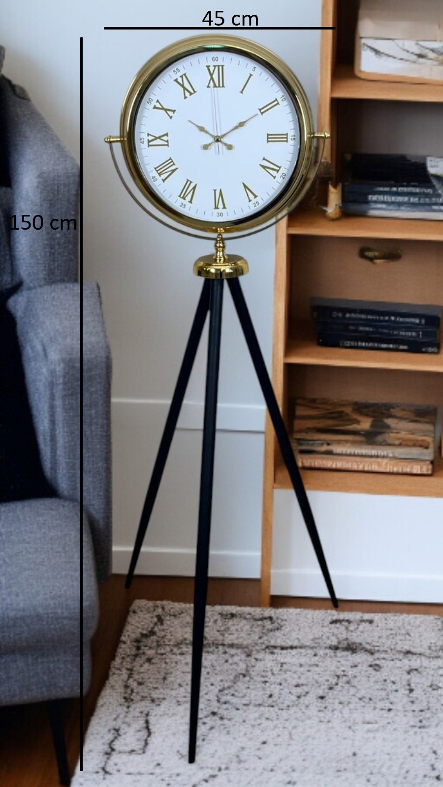 Zarif detayları ve güçlü duruşuyla öne çıkan bu gold tripod ayaklı yer saati, klasik tasarımı modern yaşam alanlarına taşıyan özel bir dekoratif üründür. Altın renkli metal çerçevesi, beyaz kadranı ve Roma rakamlı göstergeleri ile zamansız bir estetik sunar. Siyah tripod ayakları sayesinde hem dengeli bir duruş sağlar hem de bulunduğu ortama modern bir kontrast katar.